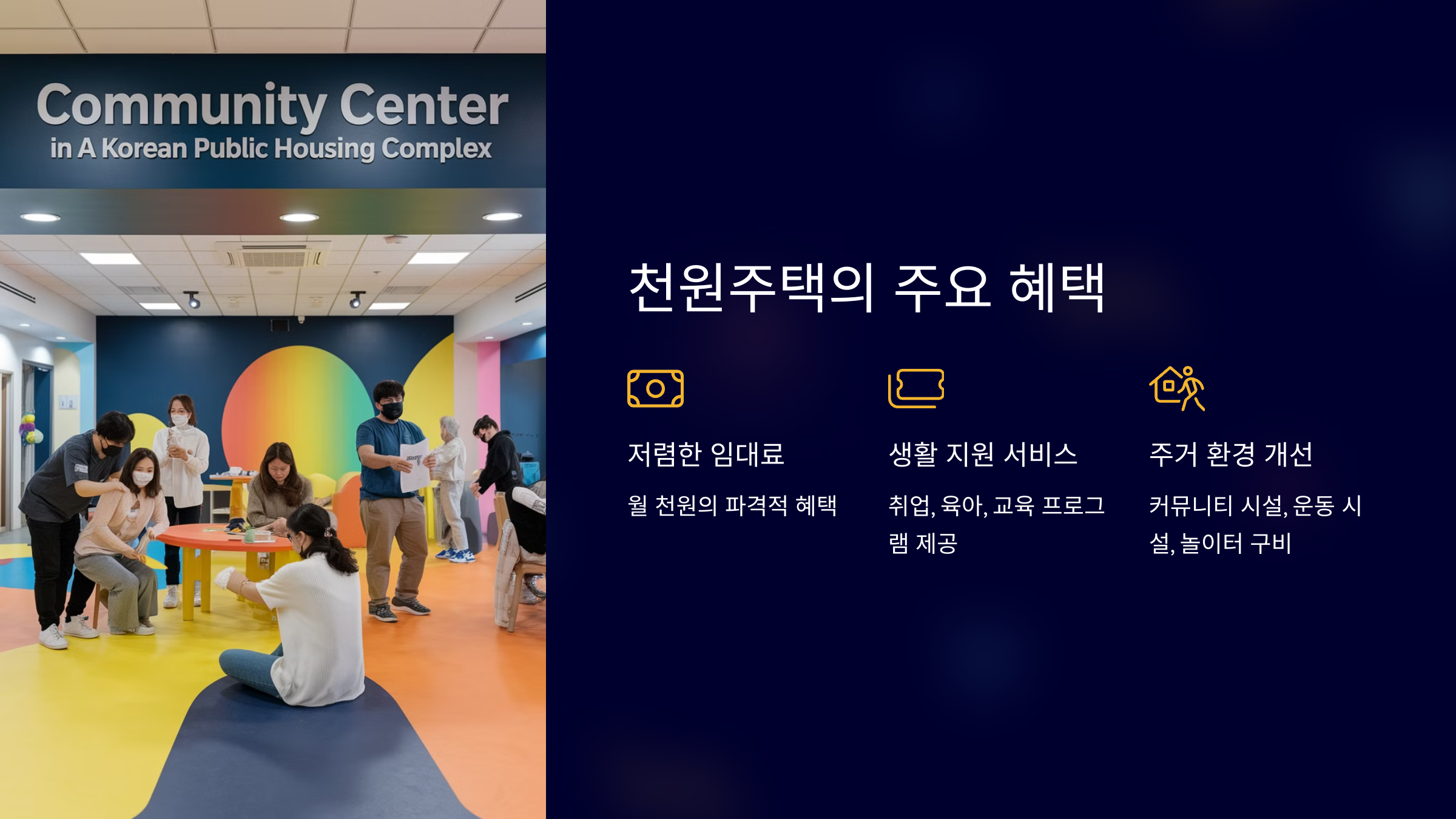 이처럼 천원주택은 단순히 주거 공간을 제공하는 것을 넘어, 입주민의 삶의 질을 높이기 위한 다양한 프로그램을 제공하고 있어요. 특히 저는 이러한 맞춤형 지원 프로그램이 입주민들에게 큰 도움이 된다고 생각해요. 😊