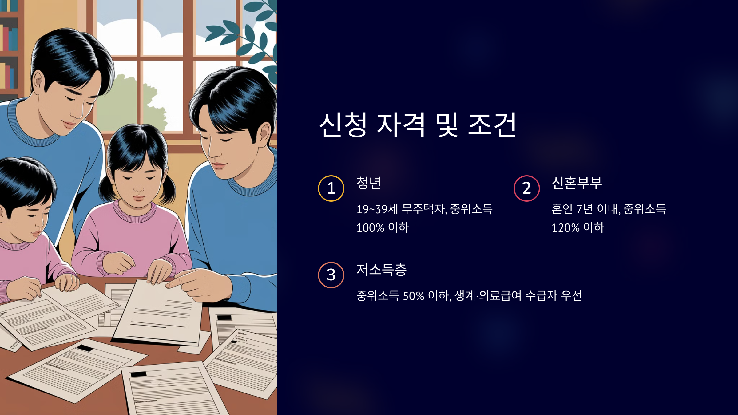 | 신혼부부 | 제한 없음 | 중위소득 120% 이하 | 맞벌이, 자녀 있는 경우 |