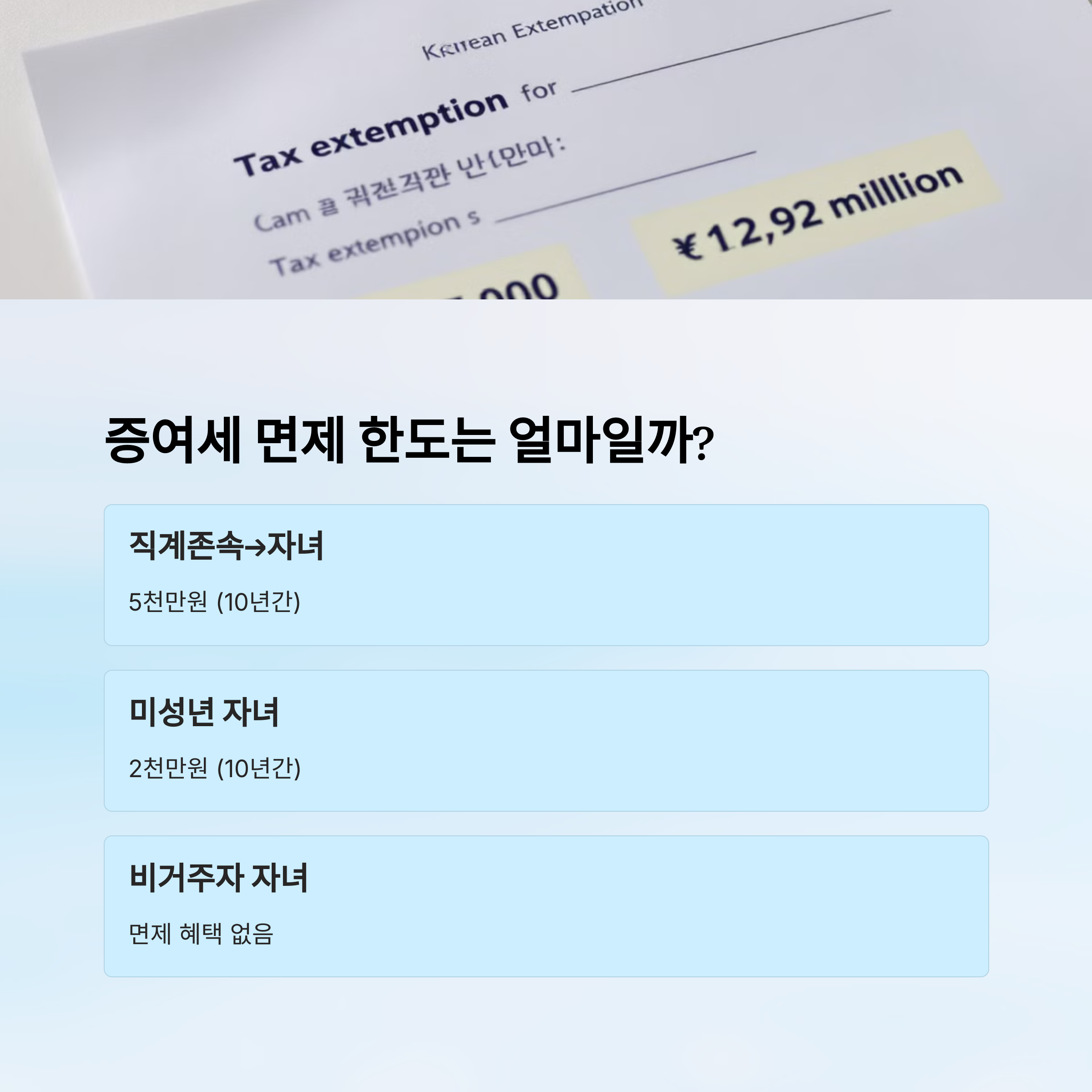 만약 자녀가 미성년자라면 면제 한도가 더 낮아요. 미성년 자녀는 10년간 2천만 원까지가 한도예요. 그리고 이 면제 한도는 각 수증인(자녀) 기준으로 적용돼요. 즉, 부모가 공동으로 송금해도 자녀 1인당 한도가 기준이 되는 거예요.