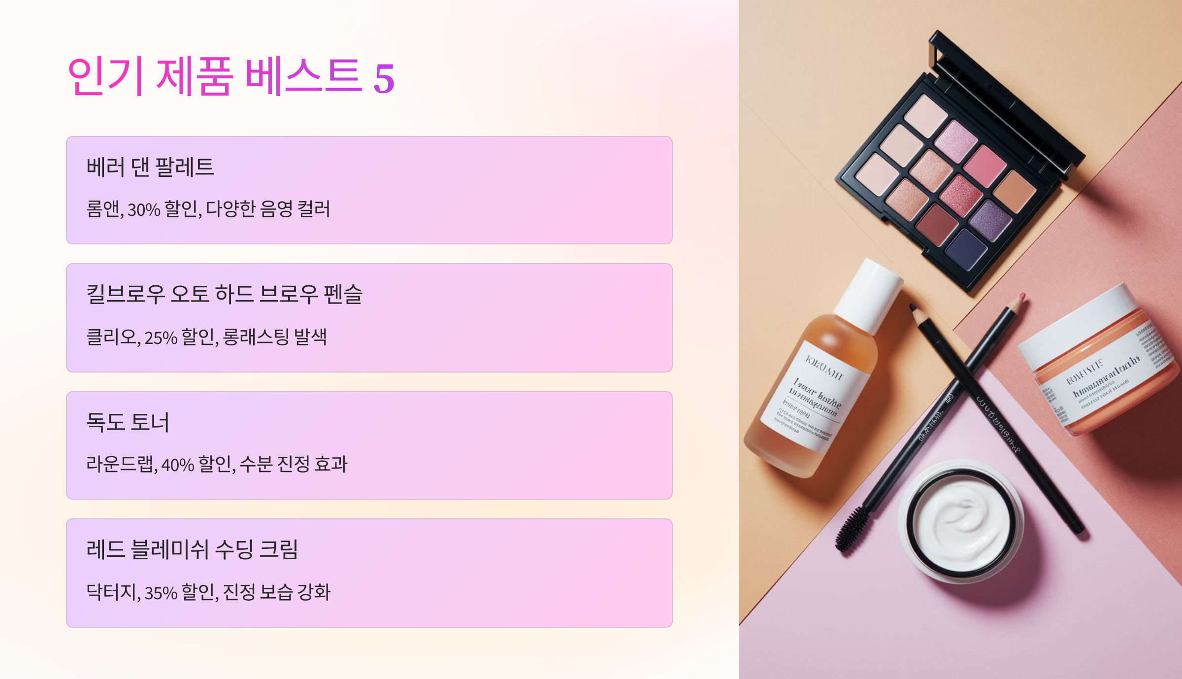 메이크업 제품 중에서는 색조 화장품이 가장 인기가 많아요. '롬앤'의 립 제품과 '클리오'의 아이 메이크업 제품은 매번 세일 때마다 빠르게 품절되니 눈여겨봐야 해요. 스킨케어는 '라운드랩 독도 라인'과 '닥터지 레드 블레미쉬' 라인이 특히 좋아요.