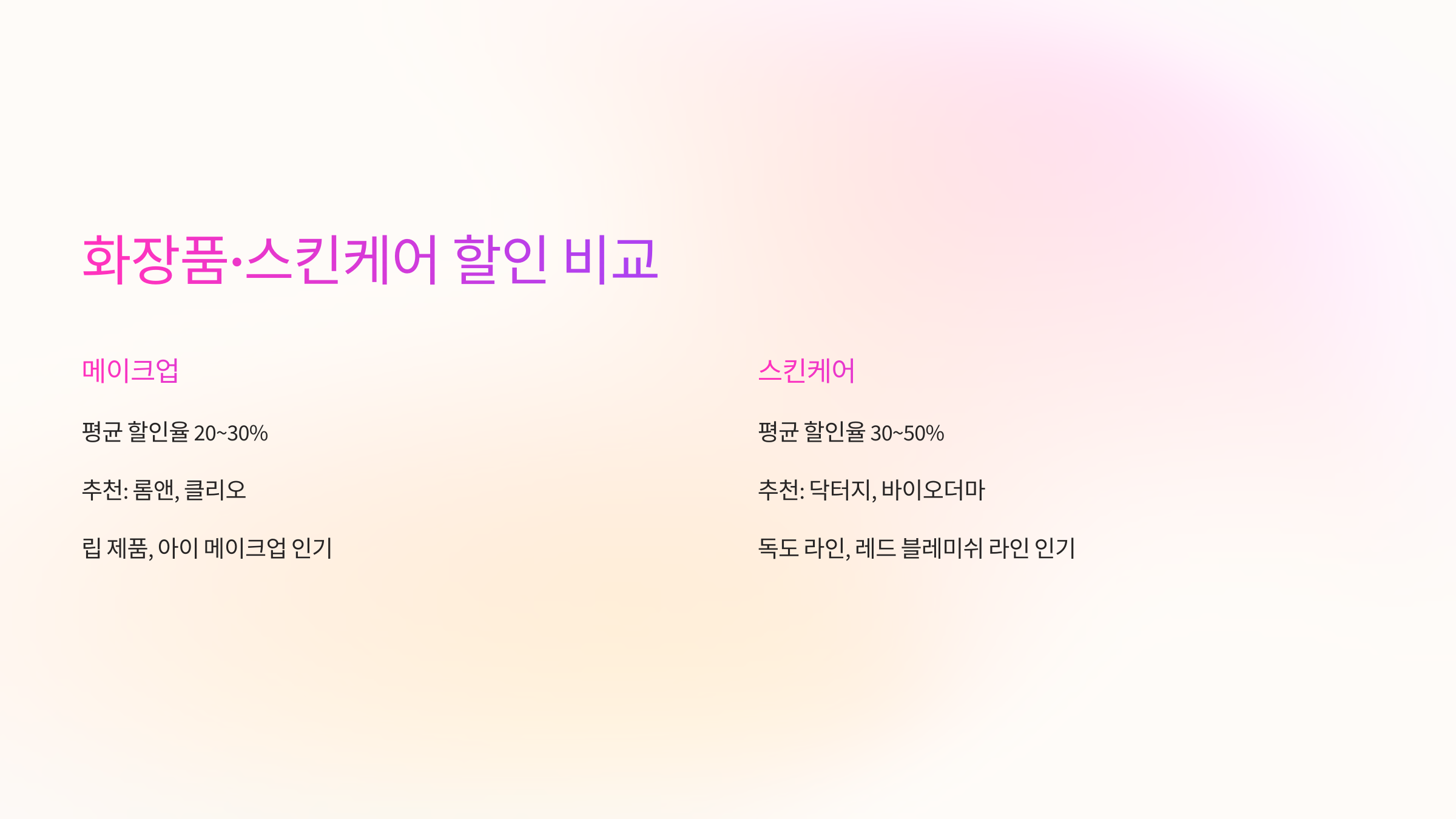 화장품과 스킨케어 제품의 할인 폭은 다소 차이가 있어요. 메이크업 제품은 대개 20~30% 할인되는 반면, 스킨케어 제품은 40% 이상 할인되는 경우도 많아요. 특히 '바이오더마'나 '닥터지' 같은 스킨케어 브랜드에서는 필수템을 저렴하게 득템할 수 있답니다.
