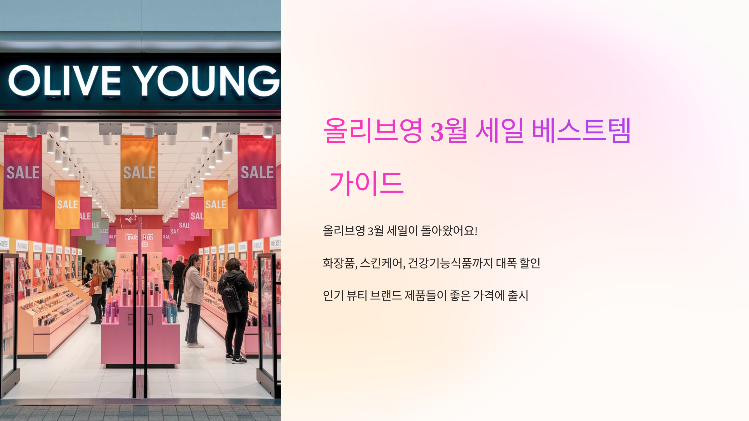 올리브영 3월 세일이 돌아왔어요! 매년 이맘때면 많은 사람들이 기대하는 세일 이벤트인데요. 화장품, 스킨케어, 건강기능식품까지 다양한 제품들이 대폭 할인되기 때문에 필요한 아이템을 미리 장만하기에 좋은 기회예요.