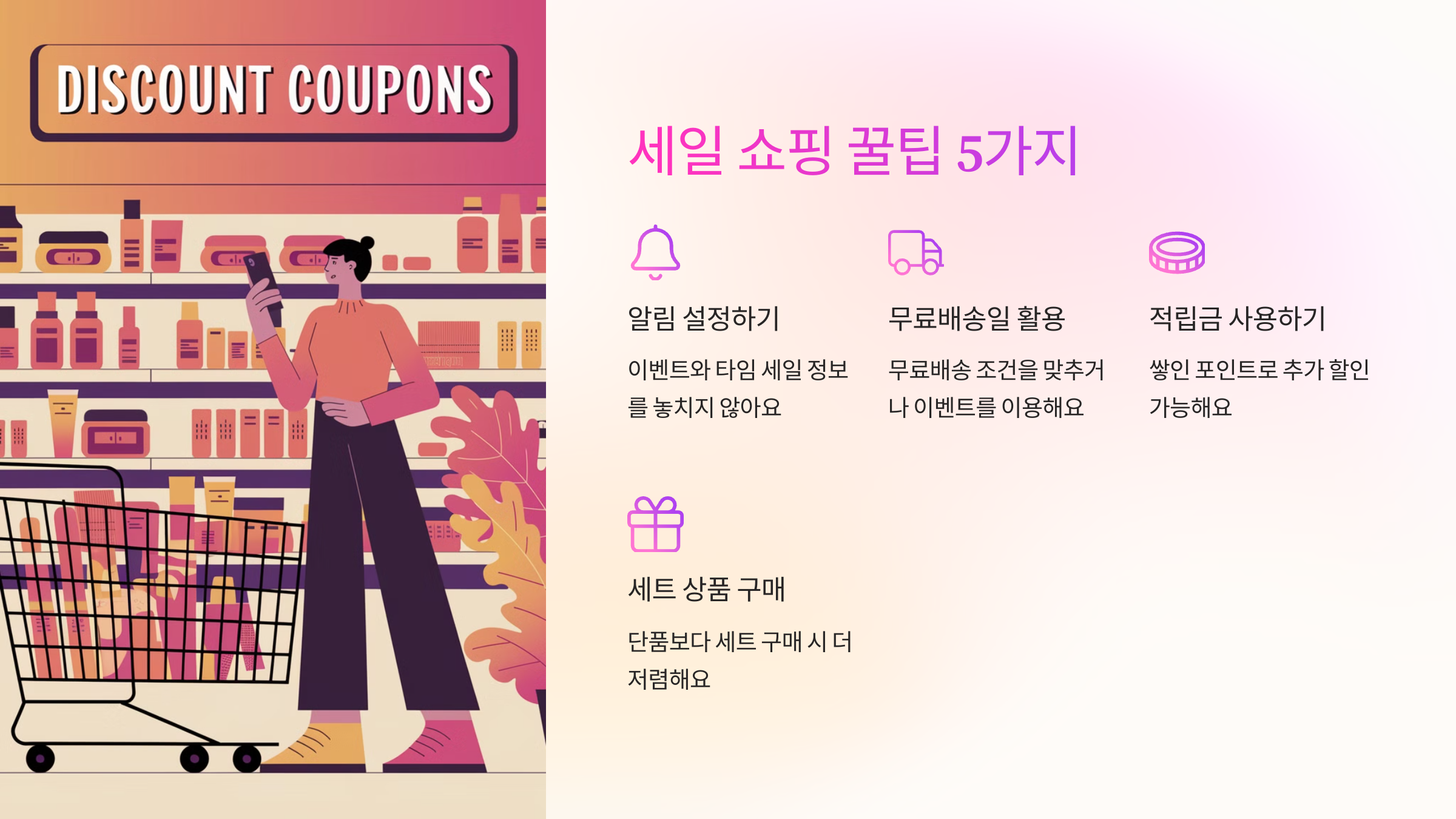 할인 제품을 구매할 때에는 꼭 가격 비교를 하고, 이벤트나 쿠폰을 최대한 활용해 보세요. 필요한 제품은 미리 장바구니에 담아 놓는 것도 잊지 마세요! 😉