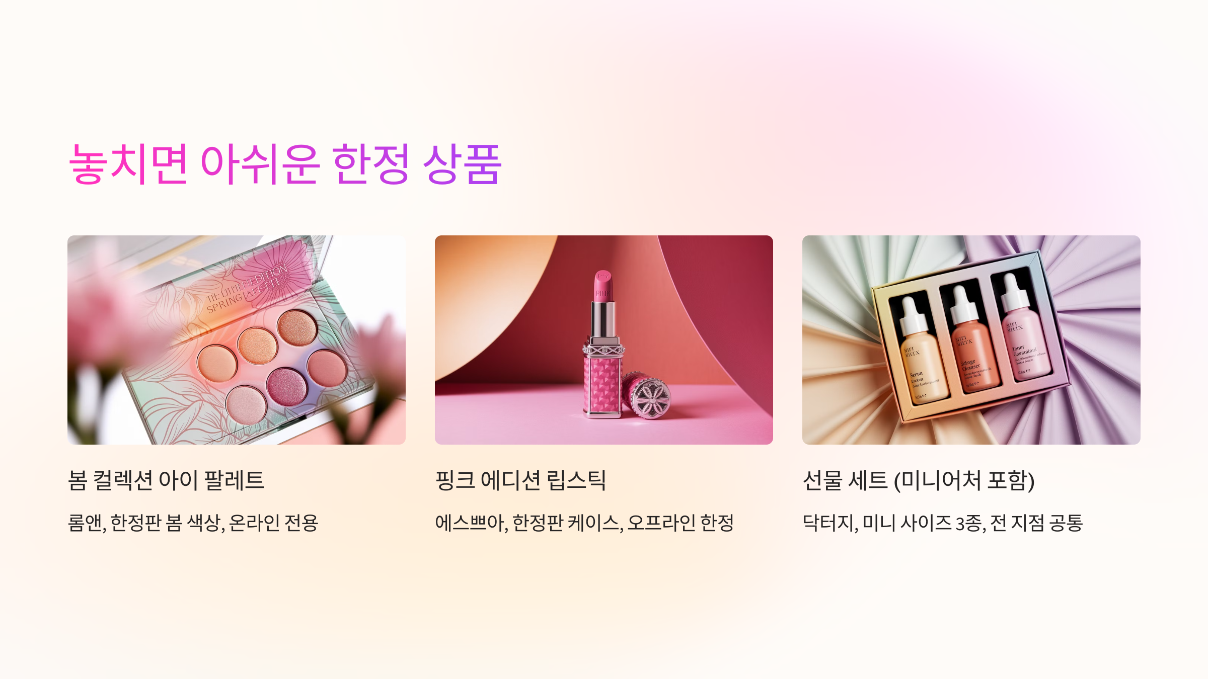 올리브영 3월 세일에서는 매번 특별한 한정 상품들이 출시되는데요, 이번에도 다양한 한정판 제품들이 여러분을 기다리고 있어요! 🛒