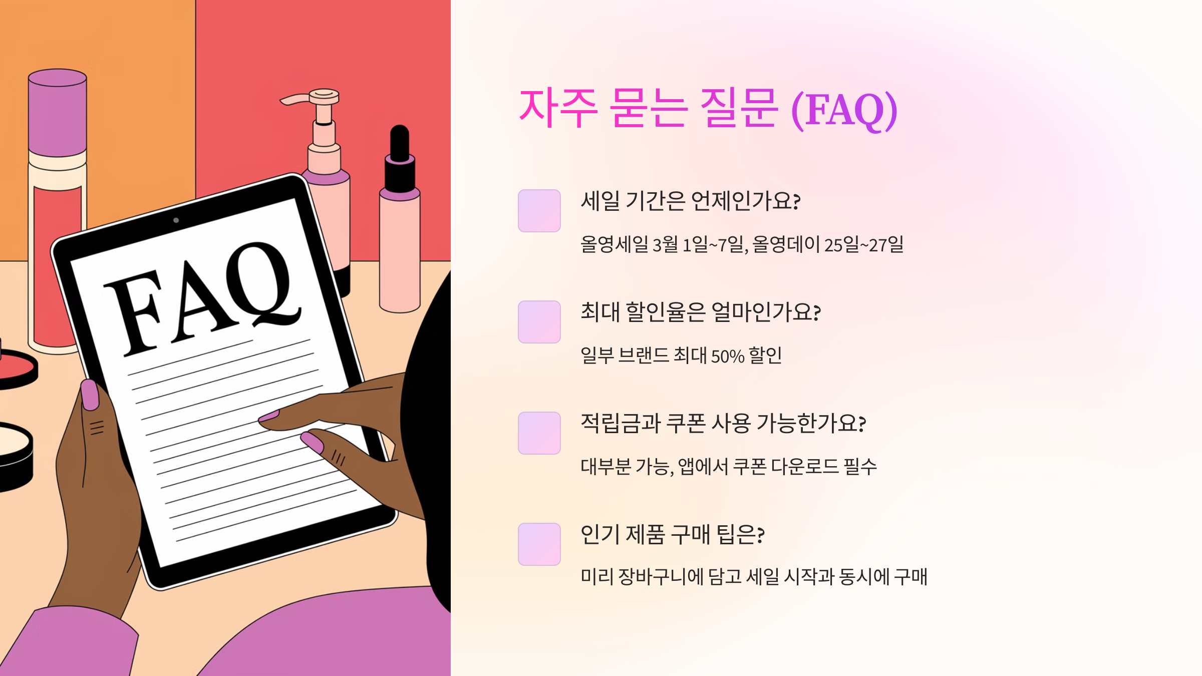 올리브영 세일을 제대로 활용하려면 몇 가지 꿀팁을 알고 있는 게 좋아요. 매년 세일 때마다 많은 분들이 후회하는 점이 있다는데요, 이번에는 그런 실수를 하지 않도록 도와드릴게요! 😊