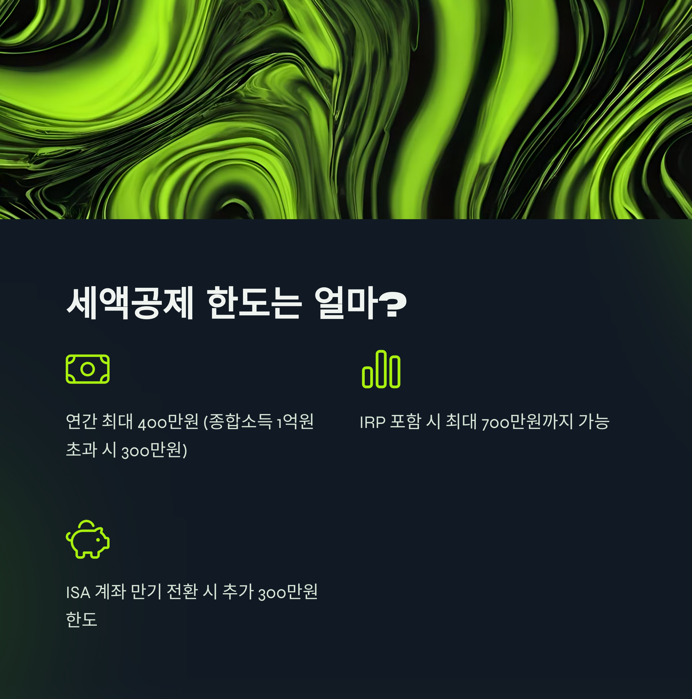 | 세액공제 한도 | 400만 원 | 700만 원 |