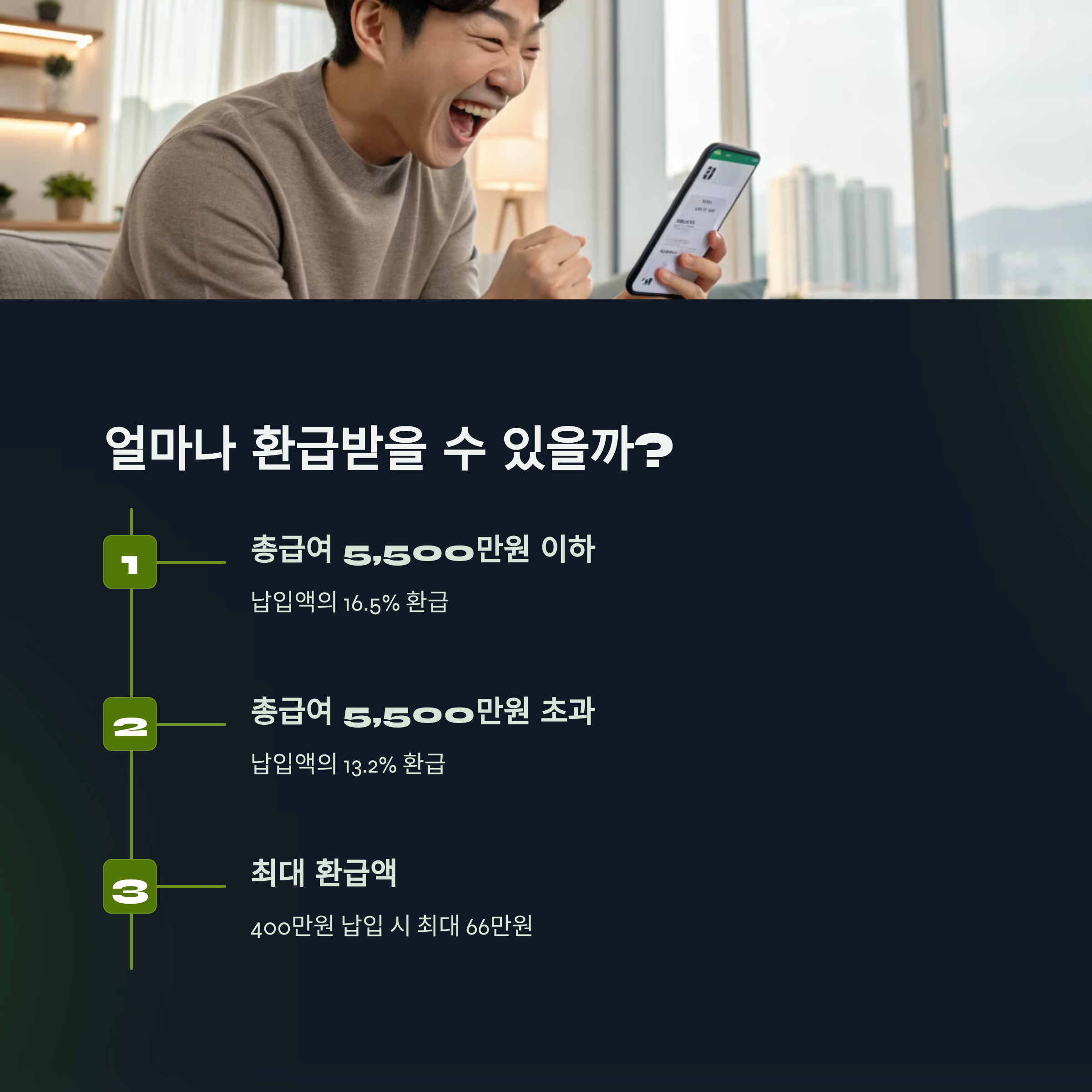 예를 들어, 연소득 5,500만 원 이하인 사람이 연금저축에 400만 원을 납입하면, 최대 66만 원을 돌려받을 수 있어요! 💰