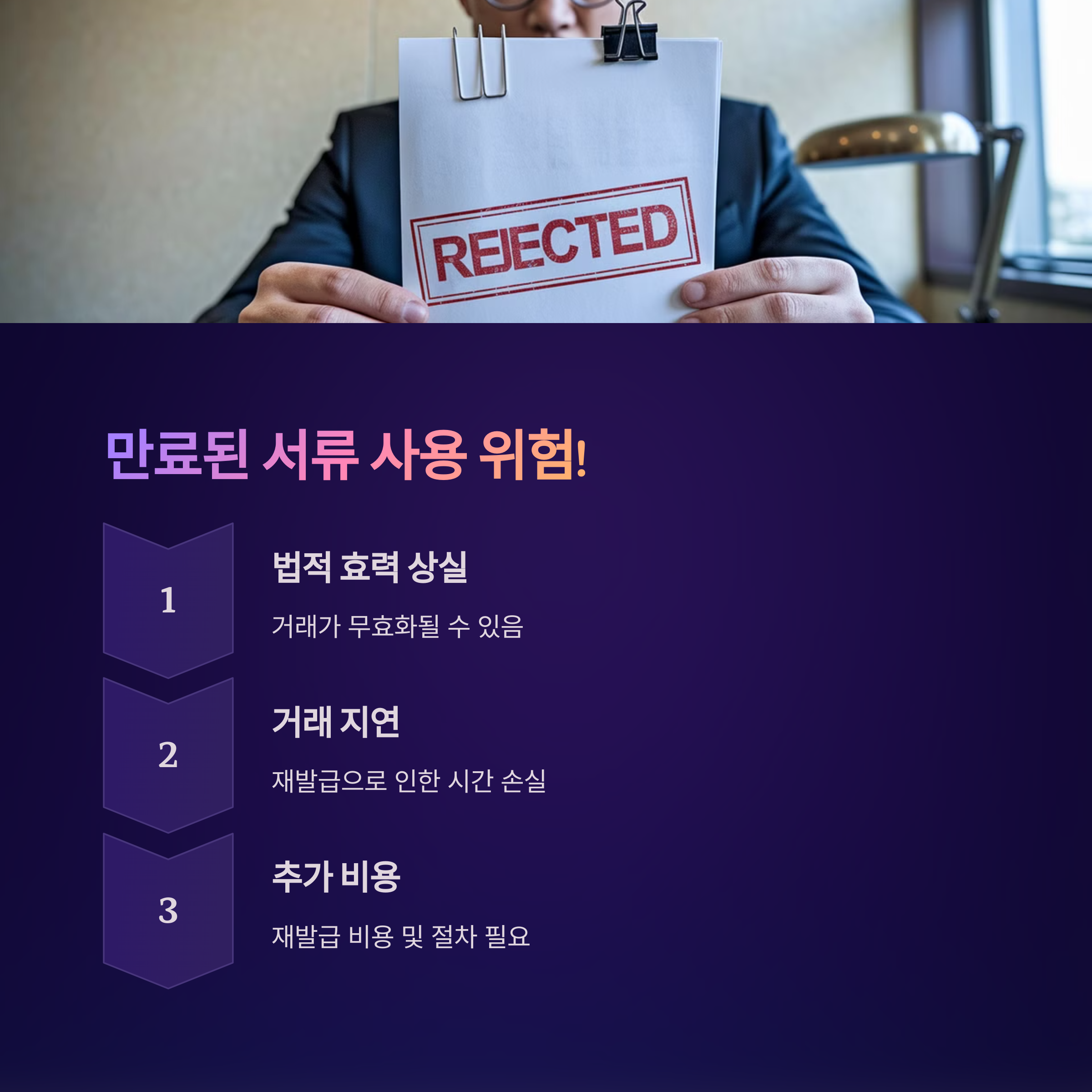 만약 유효기간이 지난 서류를 제출하면, 서류가 반려되거나 절차가 지연될 수 있어요. 심한 경우 계약이 무효가 되거나 법적 문제까지 발생할 수 있으므로 반드시 주의해야 해요.