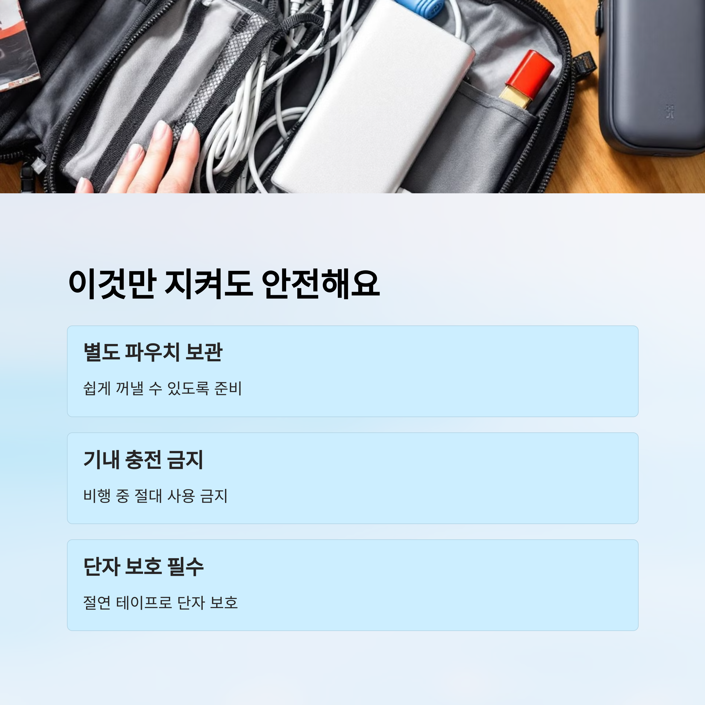 여기에 추가로, 이착륙 시 기기 전원 OFF 요구가 있는 경우, 보조배터리 연결을 해제하거나 전원까지 꺼두는 게 좋아요. 일부 항공사에선 승무원이 직접 확인하는 경우도 있어요.