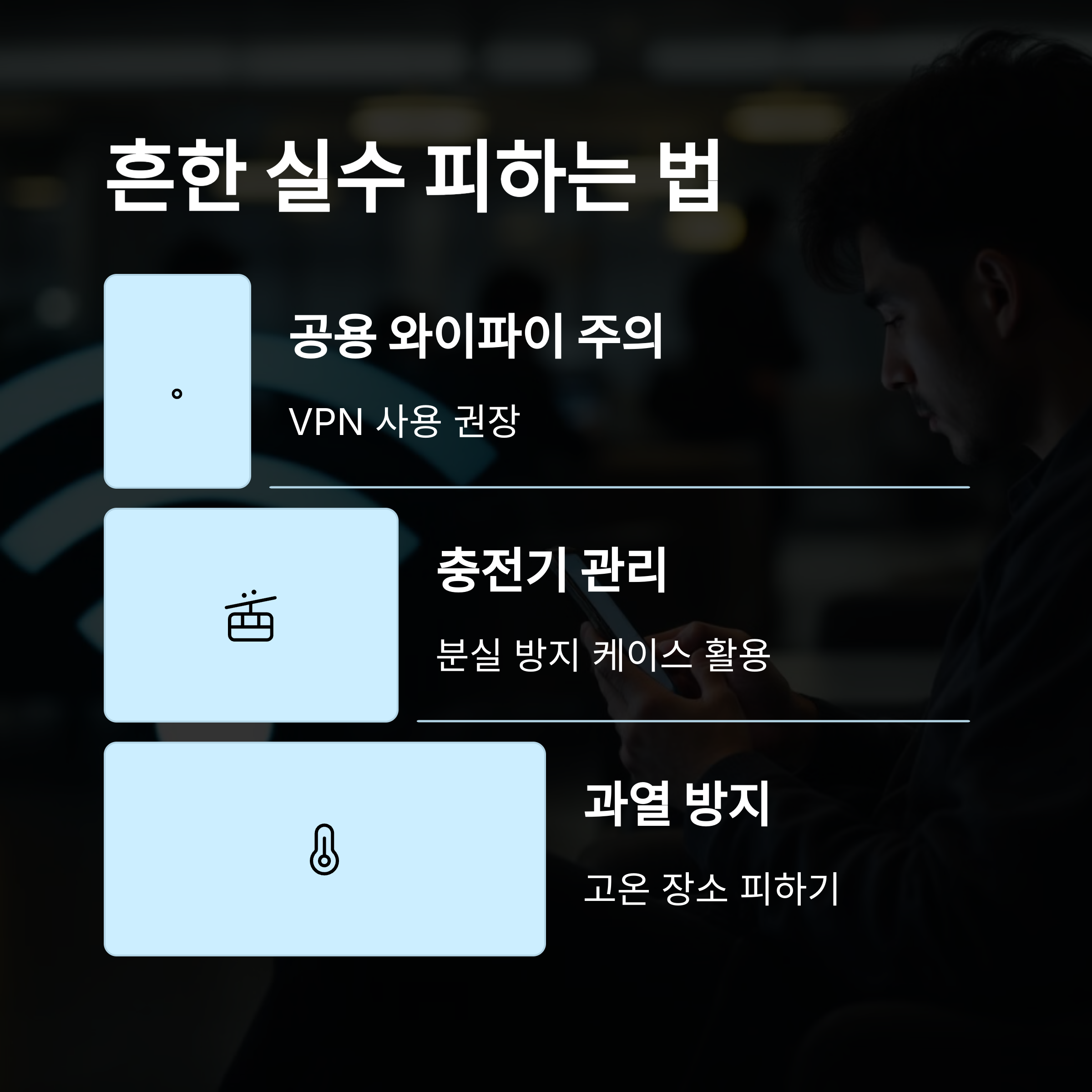 | 항상 눈앞에 두기 | 충전 중 자리 비우지 않기 | 카페, 공항 주의 |
