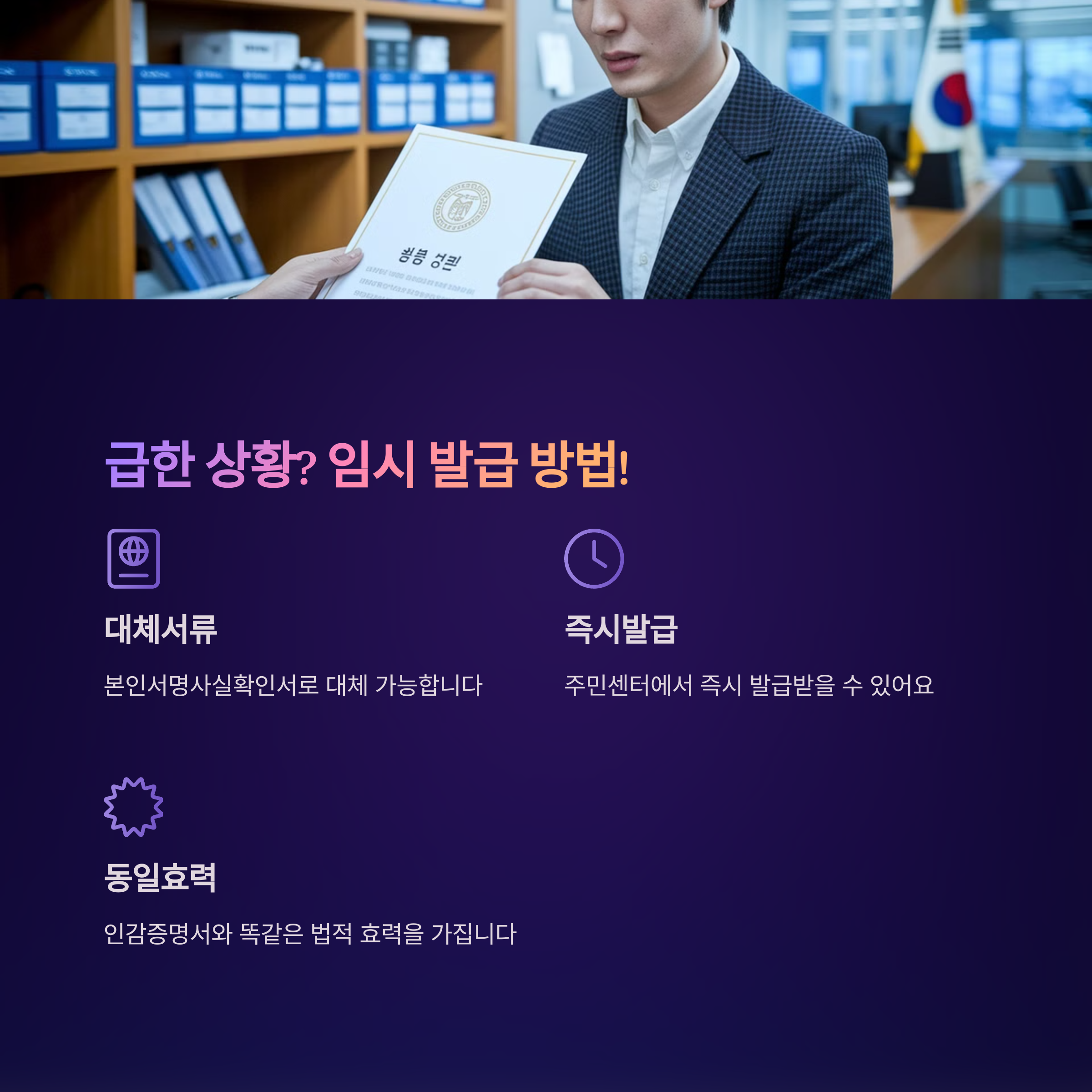 3️⃣ **긴급 필요 시 대체 방법 확인:** 인감이 필요한 상황이라면, 본인 서명 사실 확인서를 대체 발급받을 수 있어요.