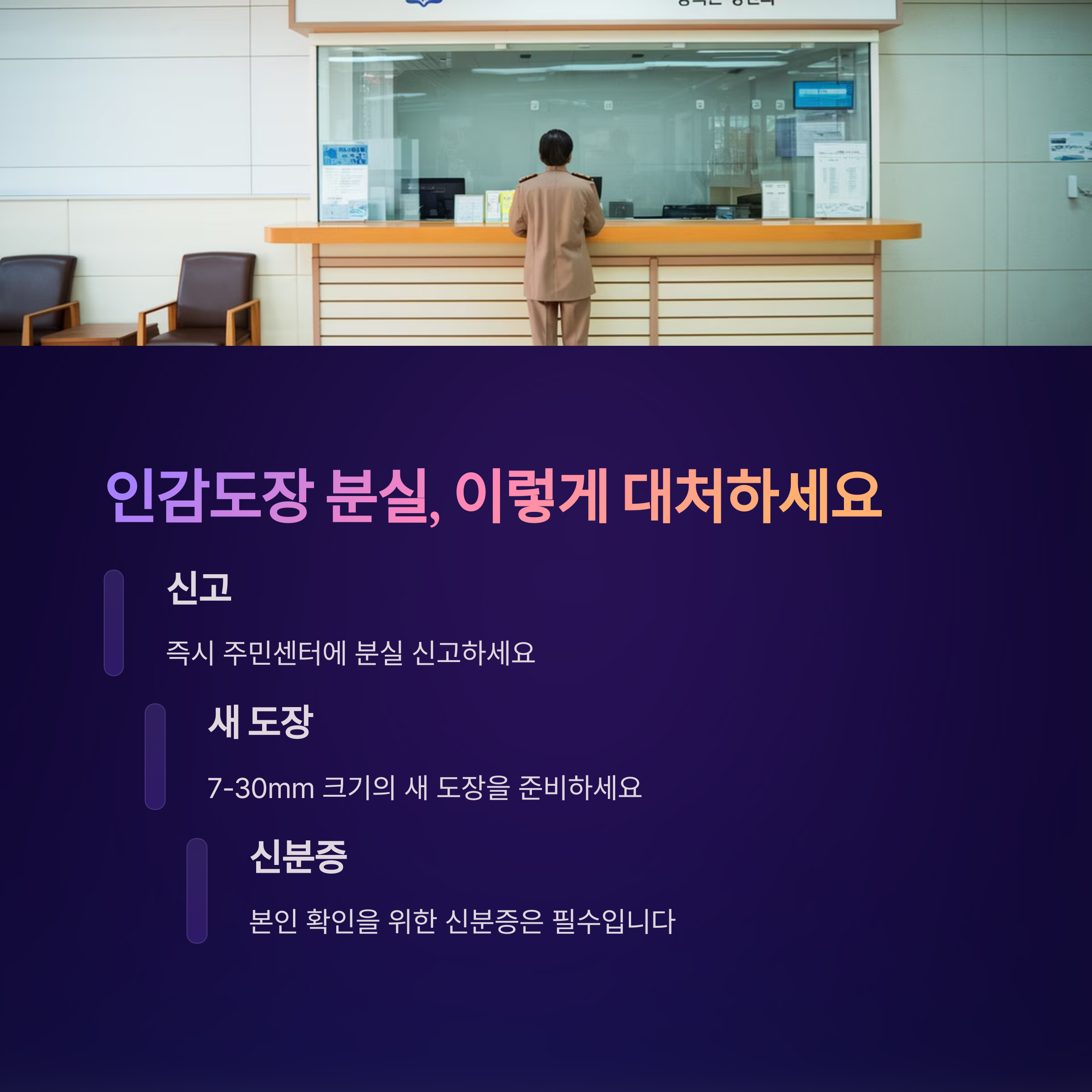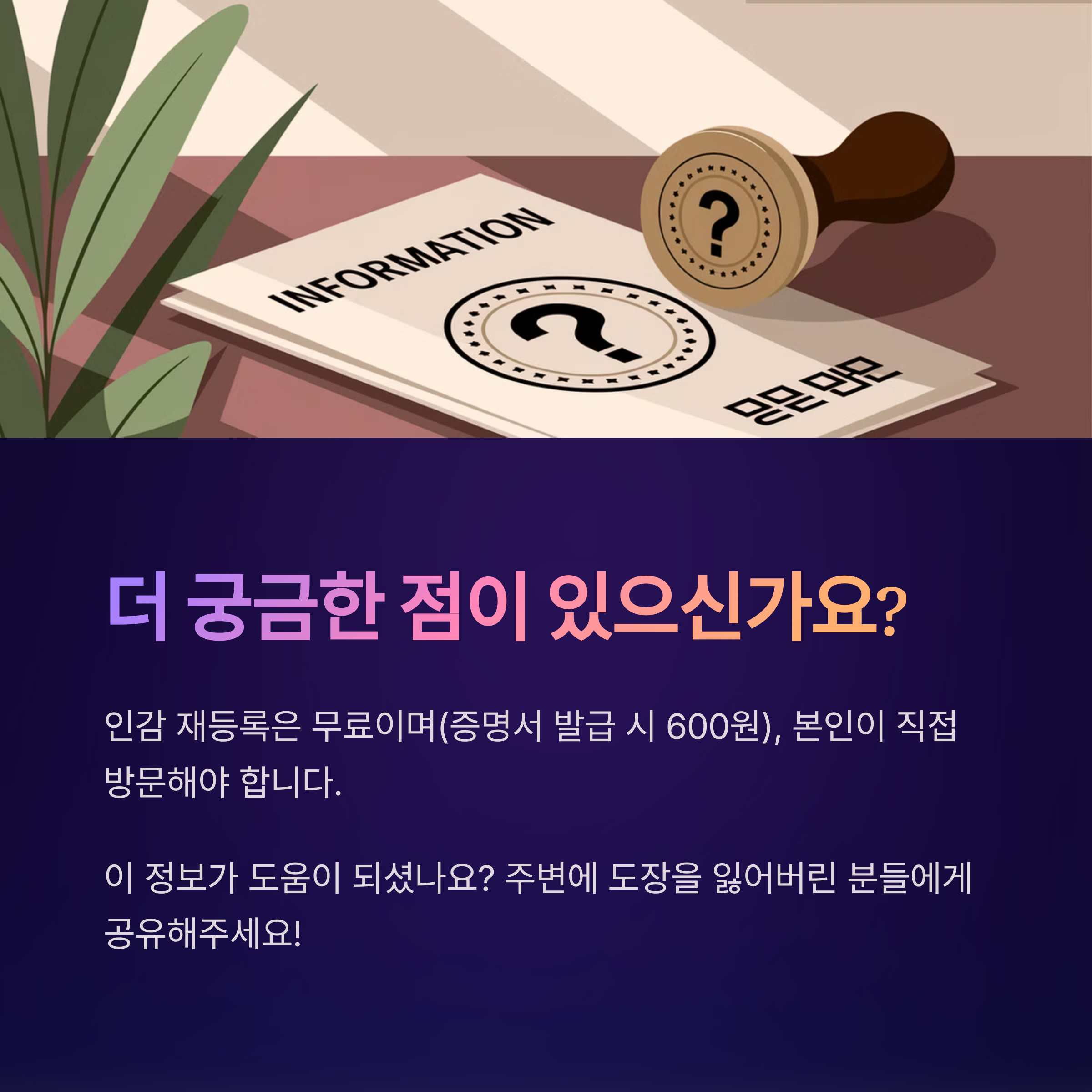 4️⃣ **새로운 인감도장 준비:** 새로운 도장을 준비한 후, 빠른 시일 내에 재등록하는 것이 중요해요.