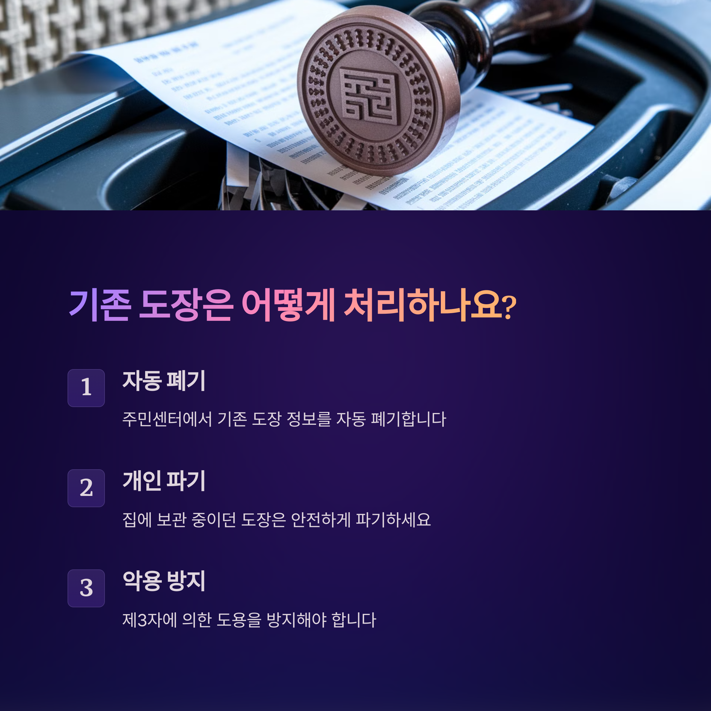 새 인감도장을 등록하면 기존 인감도장은 자동으로 폐기되지 않아요. 직접 주민센터에서 **기존 인감을 폐기 신청**해야 해요.