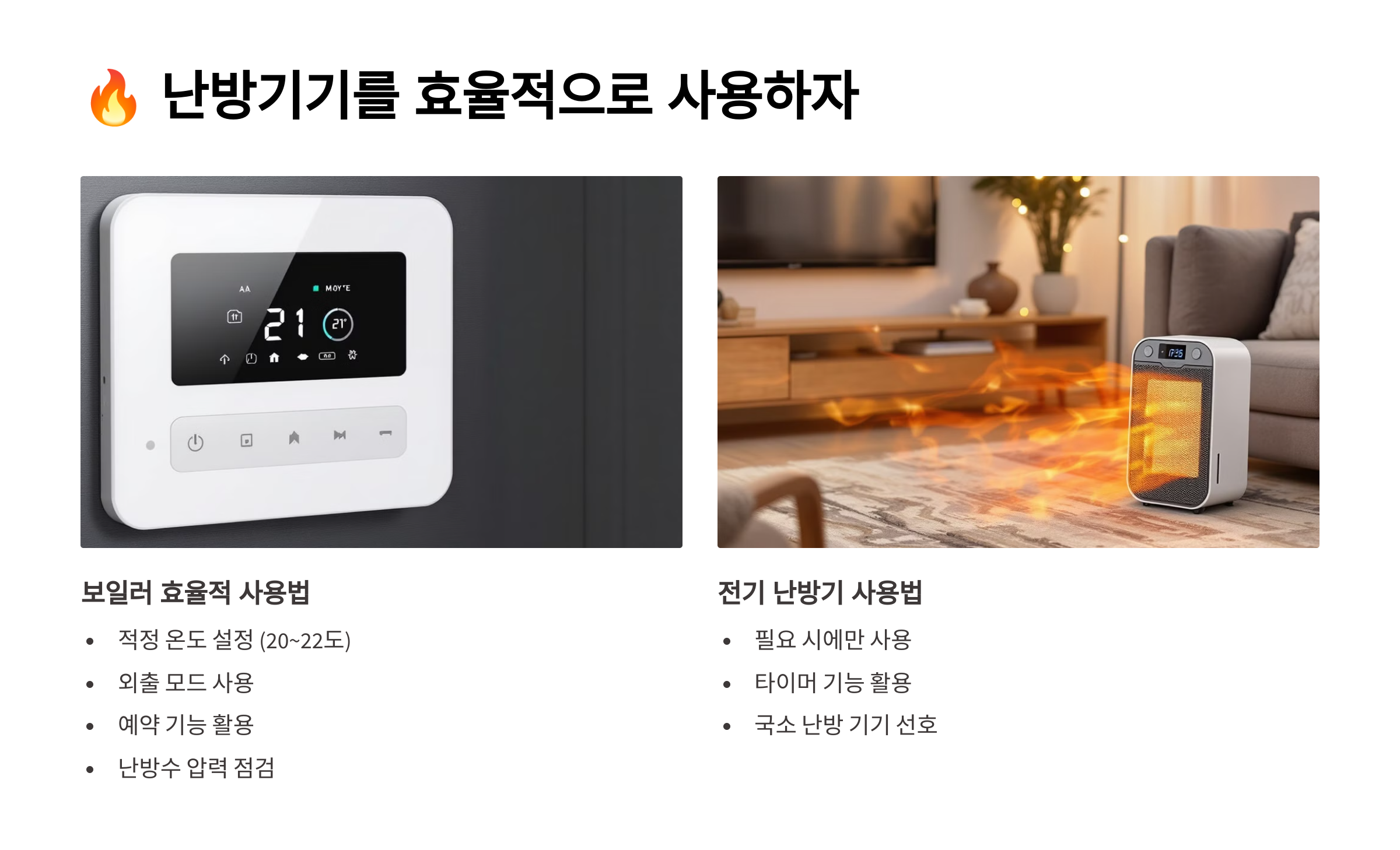 - 생활 습관 개선: 난방을 효율적으로 사용하는 습관을 들이면 큰 비용 절감 효과를 볼 수 있습니다.
