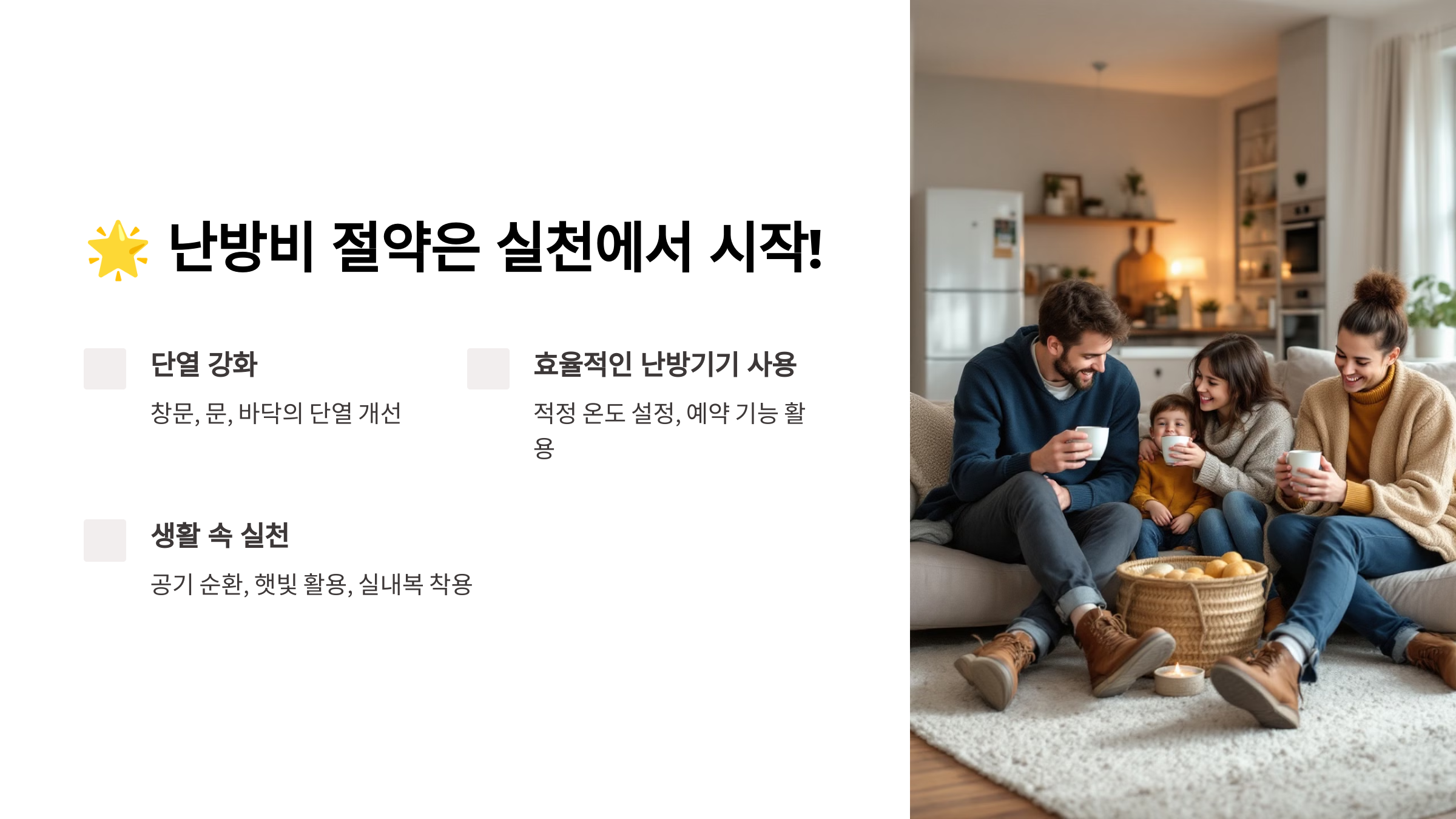 이제 여러분도 난방비를 줄이면서도 따뜻한 겨울을 보낼 준비가 되셨죠? 작은 습관과 간단한 노력만으로도 난방비 절감 효과를 크게 볼 수 있습니다.
