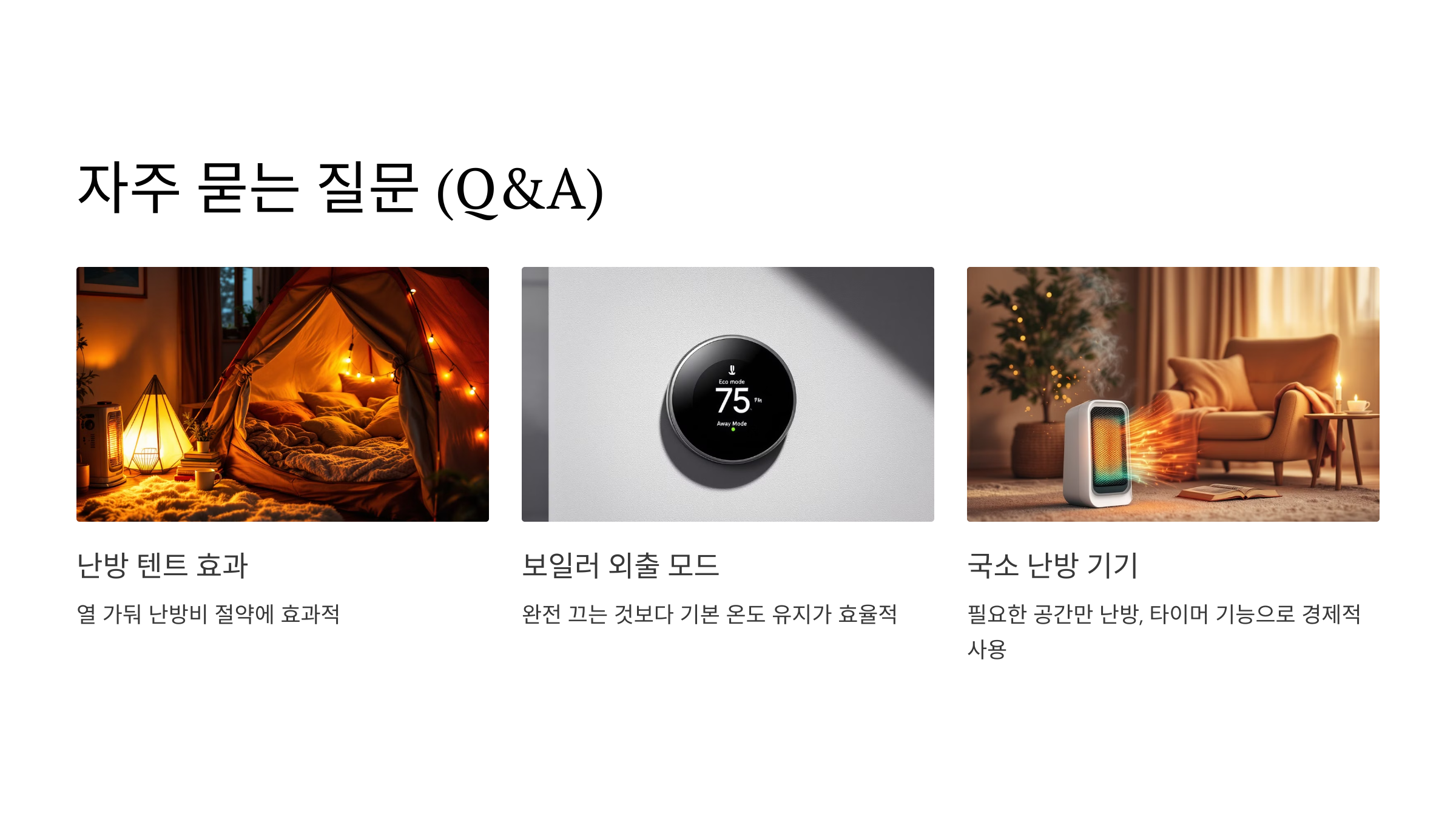 A5. 단열 작업을 강화하고, 난방 텐트나 전기요처럼 국소 난방 기기를 활용하세요. 또한, 실내 적정 온도를 유지하고 외출 모드를 활용하는 것도 중요합니다.