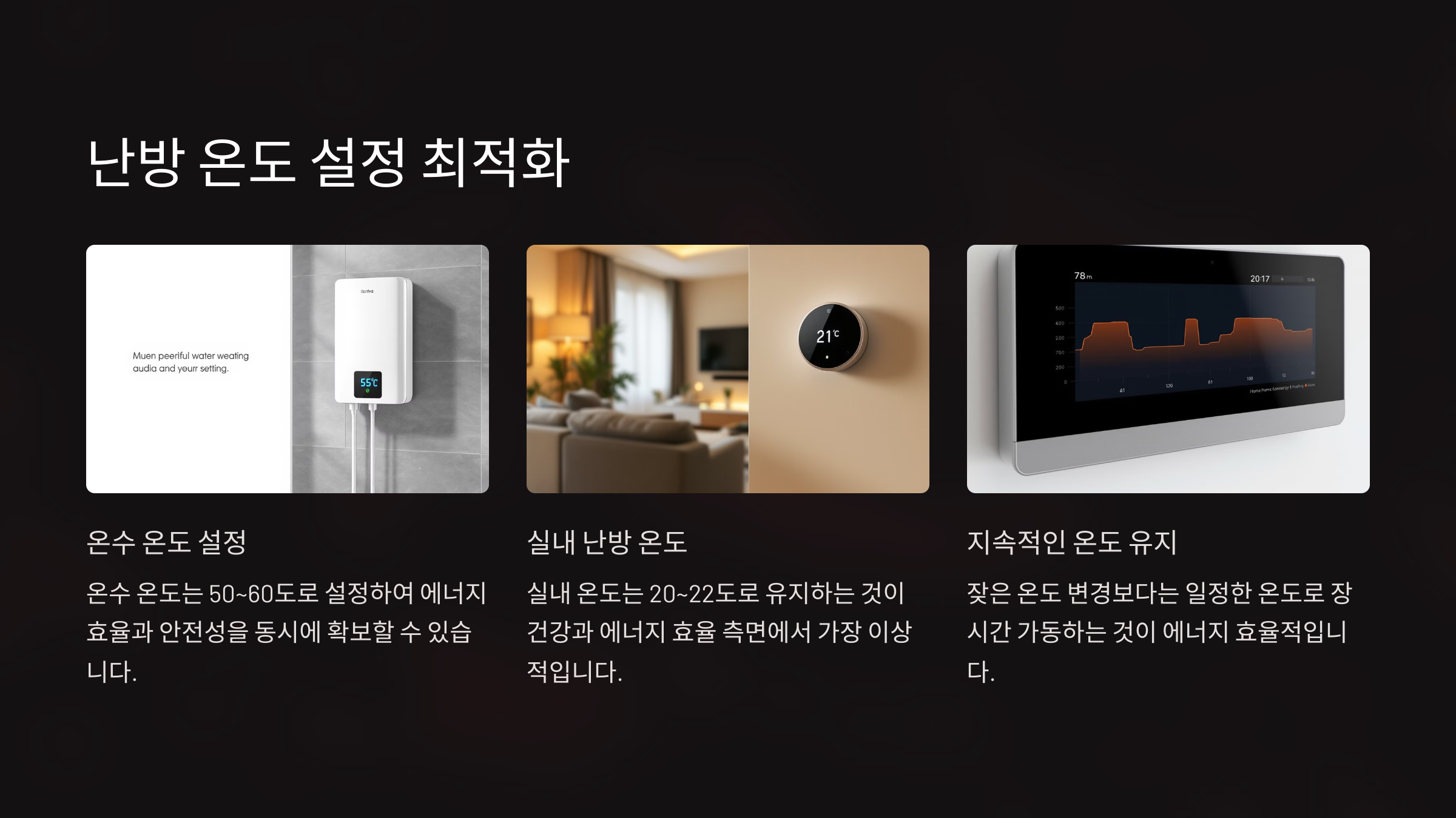 - 난방 온도: 실내 난방 온도는 20~22도가 가장 효율적입니다. 외출 시에는 '외출 모드'로 설정해 기본 온도를 유지하세요.