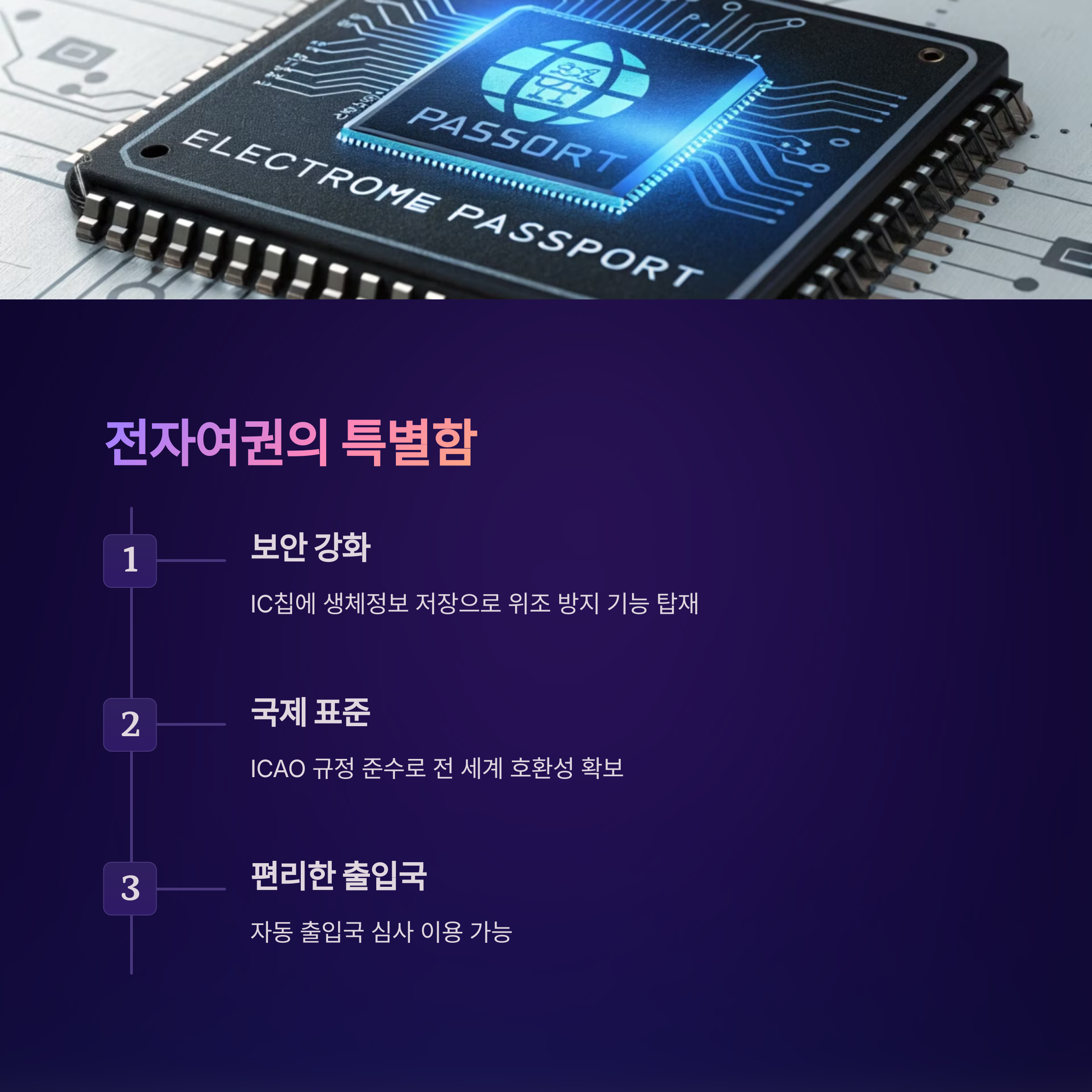 전자여권에는 칩이 내장되어 있어 위변조 방지가 강화되었고, 자동 출입국 심사(셀프심사대)를 이용할 수 있어요. 반면, 일반여권은 이런 기능이 없고, 국가에 따라 입국 시 불편이 있을 수도 있어요.