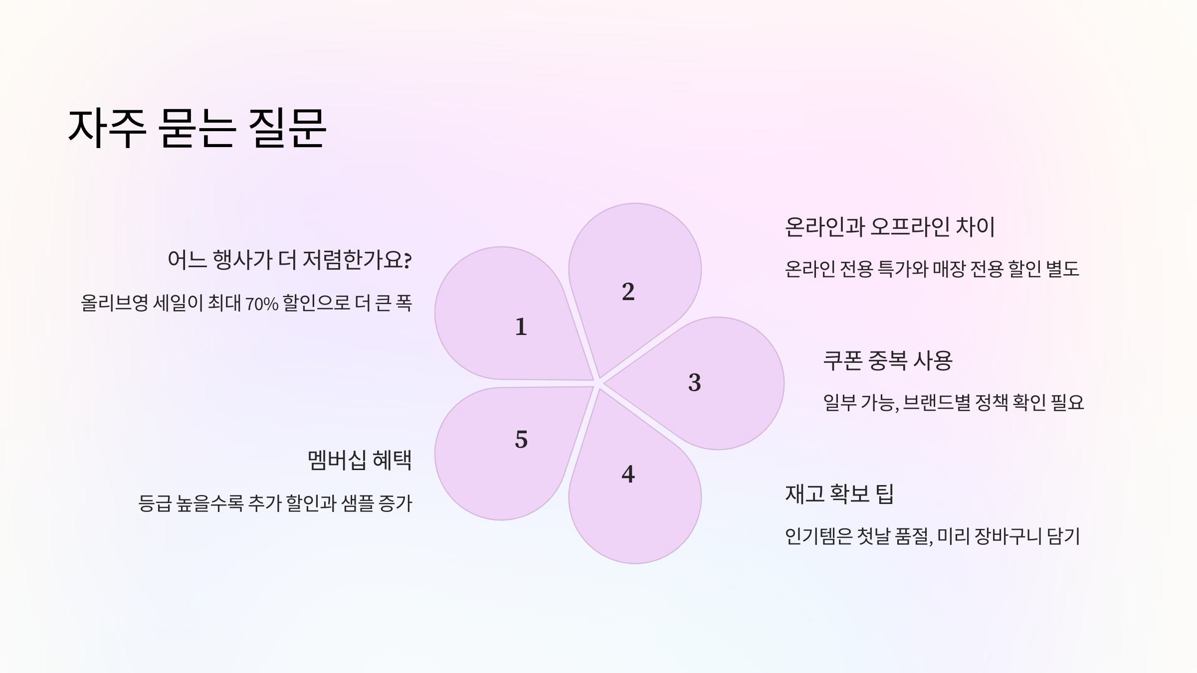A1. 올리브영 세일은 최대 70%까지 할인이 적용되기 때문에 할인폭이 더 커요. 하지만 올영데이는 멤버십 회원에게만 적용되며, 추가 샘플 혜택이 있어요!