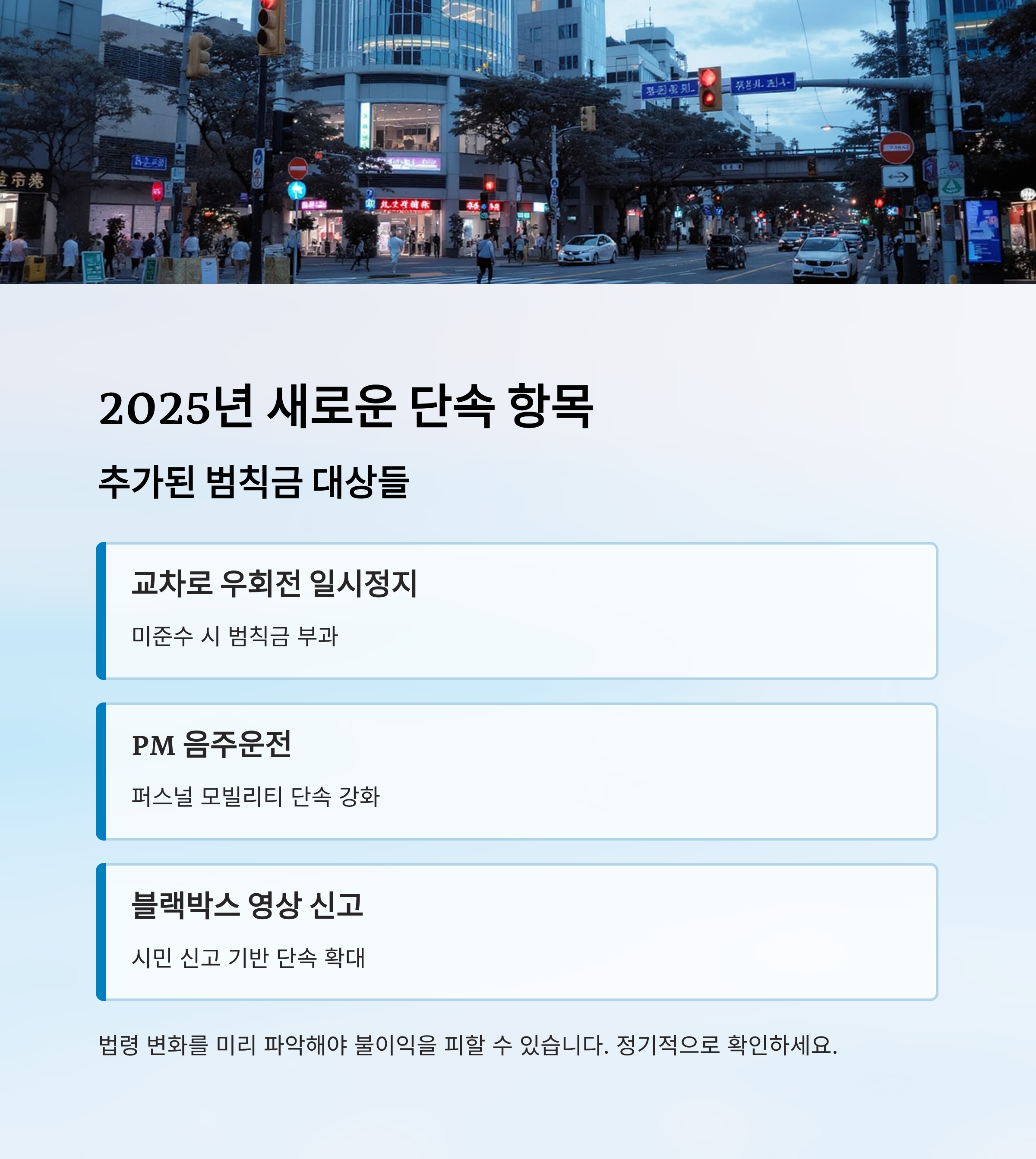 📢 단속은 '예고 없는 변화'에요. 2025년부터는 교차로 우회전 일시정지, PM 음주운전, 블랙박스 영상 기반 신고 등이 확대되면서 더 많은 항목이 범칙금 대상에 포함될 예정이에요.