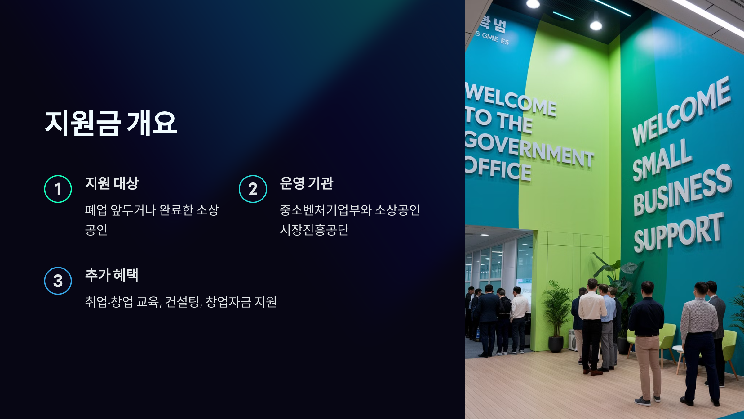 이처럼 단순히 폐업 지원금을 지급하는 것뿐만 아니라 **재취업 및 재창업을 위한 종합적인 지원이 포함**되어 있어요. 지원금 신청 전 **본인의 상황에 맞는 추가 지원 프로그램도 함께 고려**하는 것이 좋아요.
