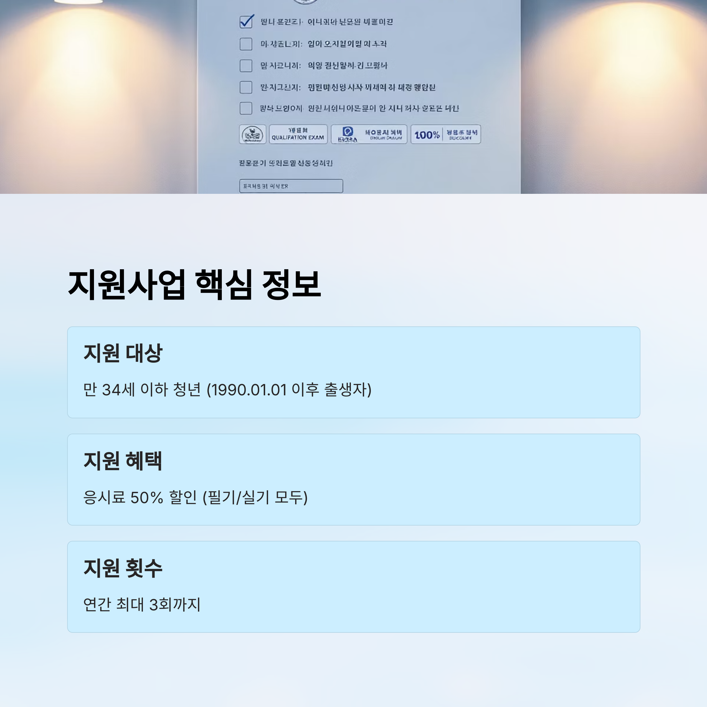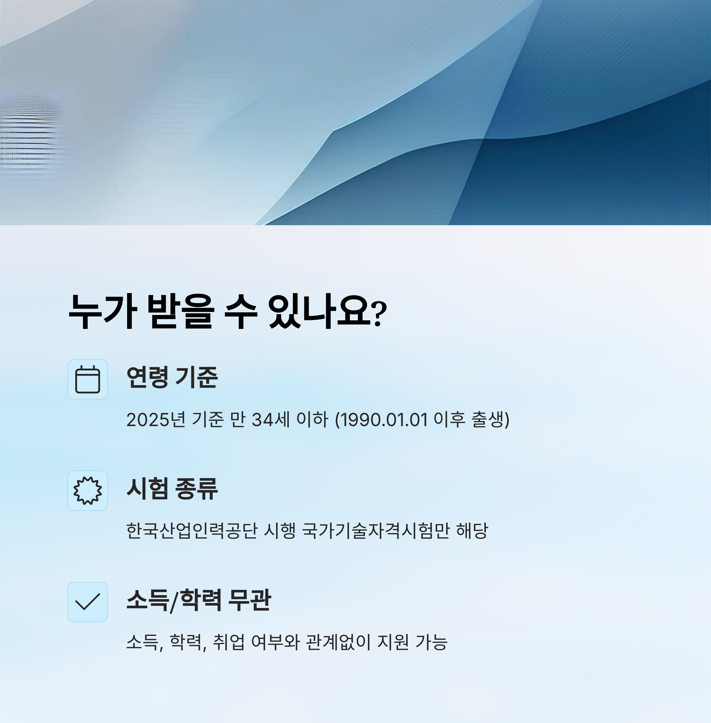 소득 수준이나 학력, 현재 취업 상태와 관계없이 조건은 딱 하나예요. 연령과 시험 종류만 맞으면 누구든 지원받을 수 있어요. 참 쉽죠? 😊