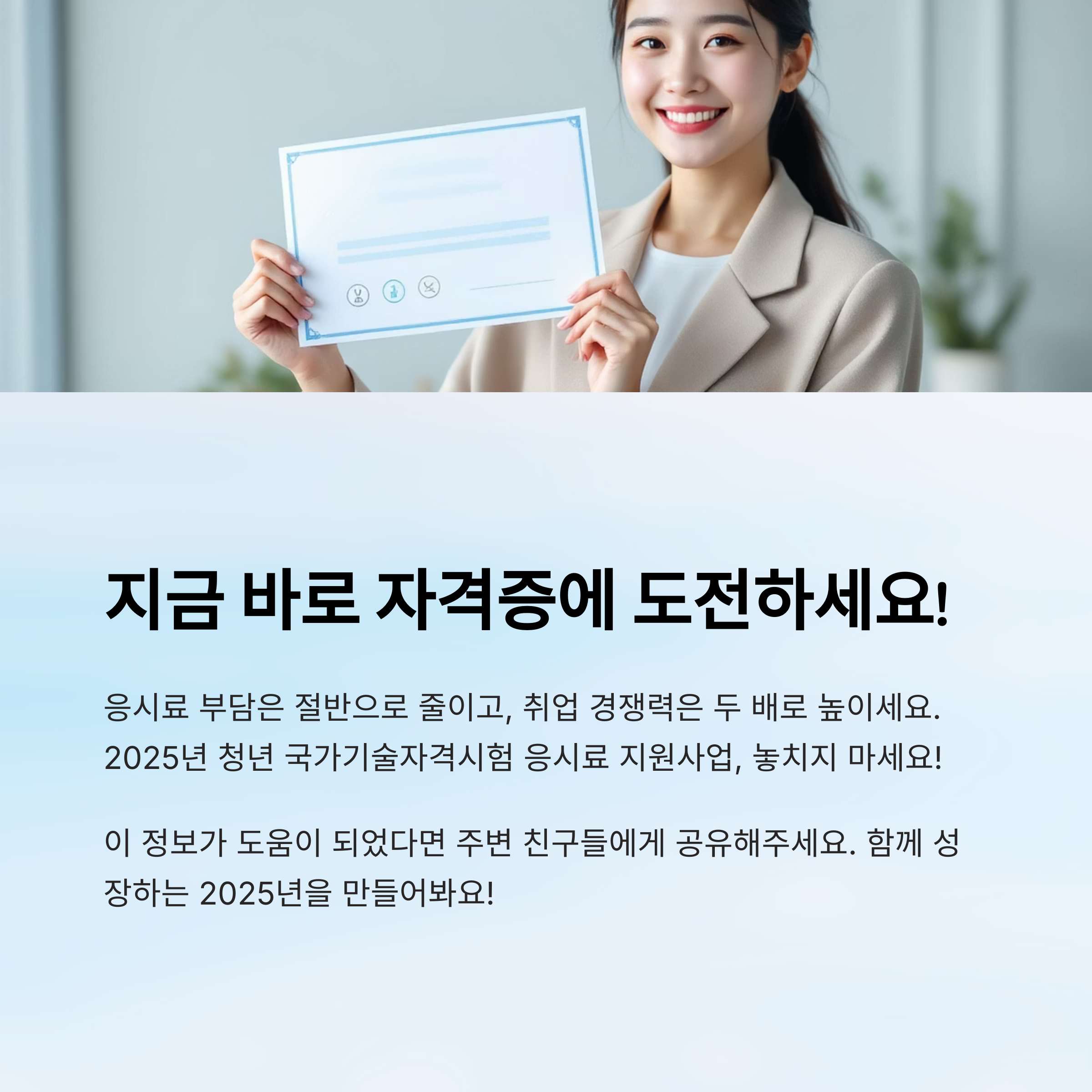 내가 생각했을 때 이 정도로 효율적인 정책은 정말 드물어요. 특히 자격증이 경력에 필수적인 요즘 같은 시대에, 이런 정부지원은 큰 도움이 돼요! 응시료 부담으로 시험을 미뤘던 분이라면 바로 도전해보세요! 💪