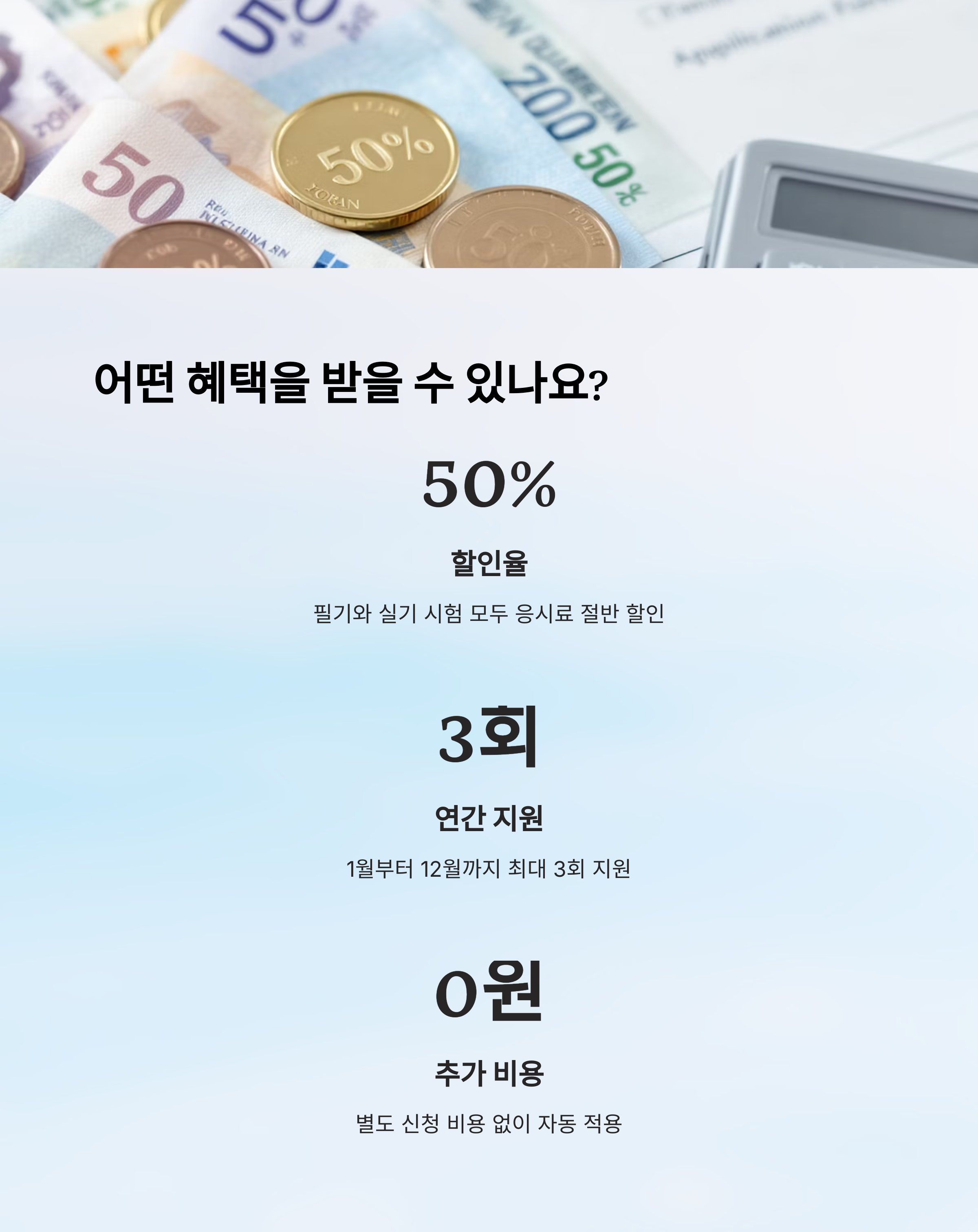 이 사업의 가장 큰 혜택은 시험 응시료의 50% 지원이에요. 필기와 실기 모두 포함돼서, 한 시험을 완전히 준비하는 데 필요한 비용의 절반을 줄일 수 있죠. 예를 들어 4만 원의 필기시험이라면, 실제로는 2만 원만 결제하게 되는 거예요.