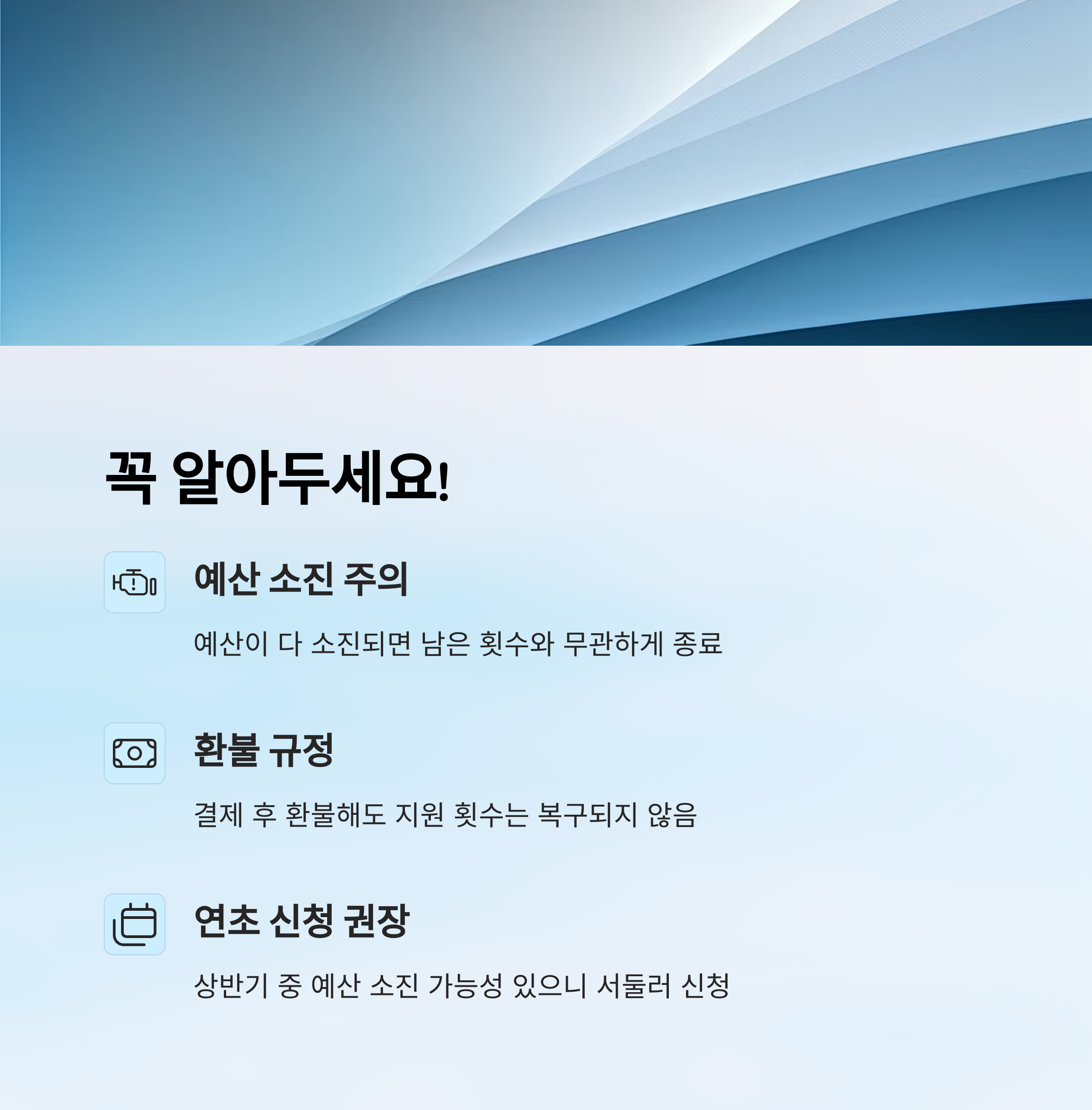 세 번째 실수는 예산 소진을 놓치는 것이에요. 신청 가능 기간은 1월부터지만, 예산이 먼저 소진되면 바로 마감되거든요. "아직 기회 있겠지~" 하고 미루다가 아예 못 받는 경우 많아요.
