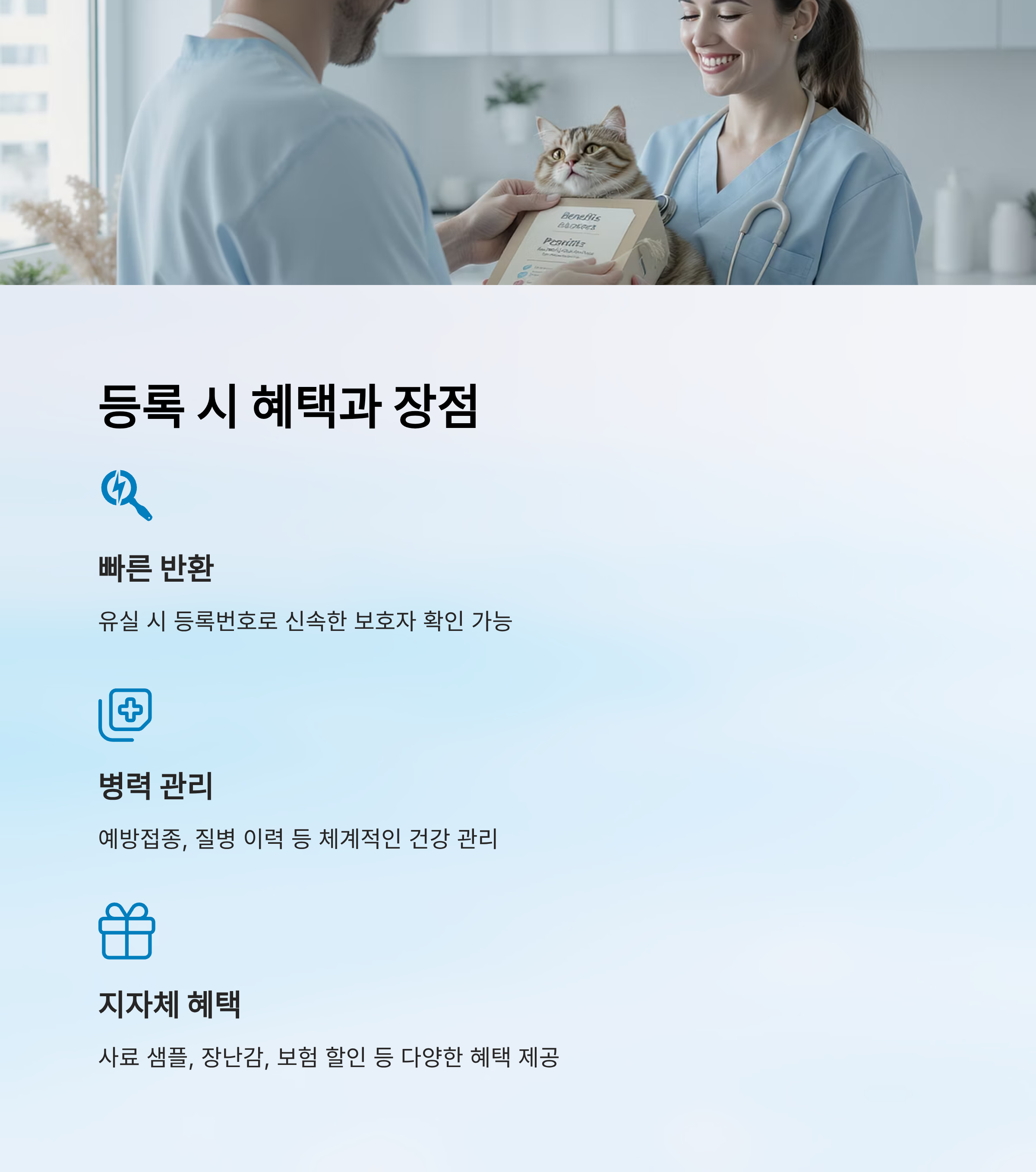 두 번째는 동물병력 관리에 도움이 돼요. 등록 정보에는 예방접종 기록, 질병 이력 등이 함께 포함되기 때문에, 동물병원 진료 시 빠르고 정확한 처치가 가능해져요. 특히 고양이가 만성 질환을 앓고 있다면 더 큰 도움이 되죠.