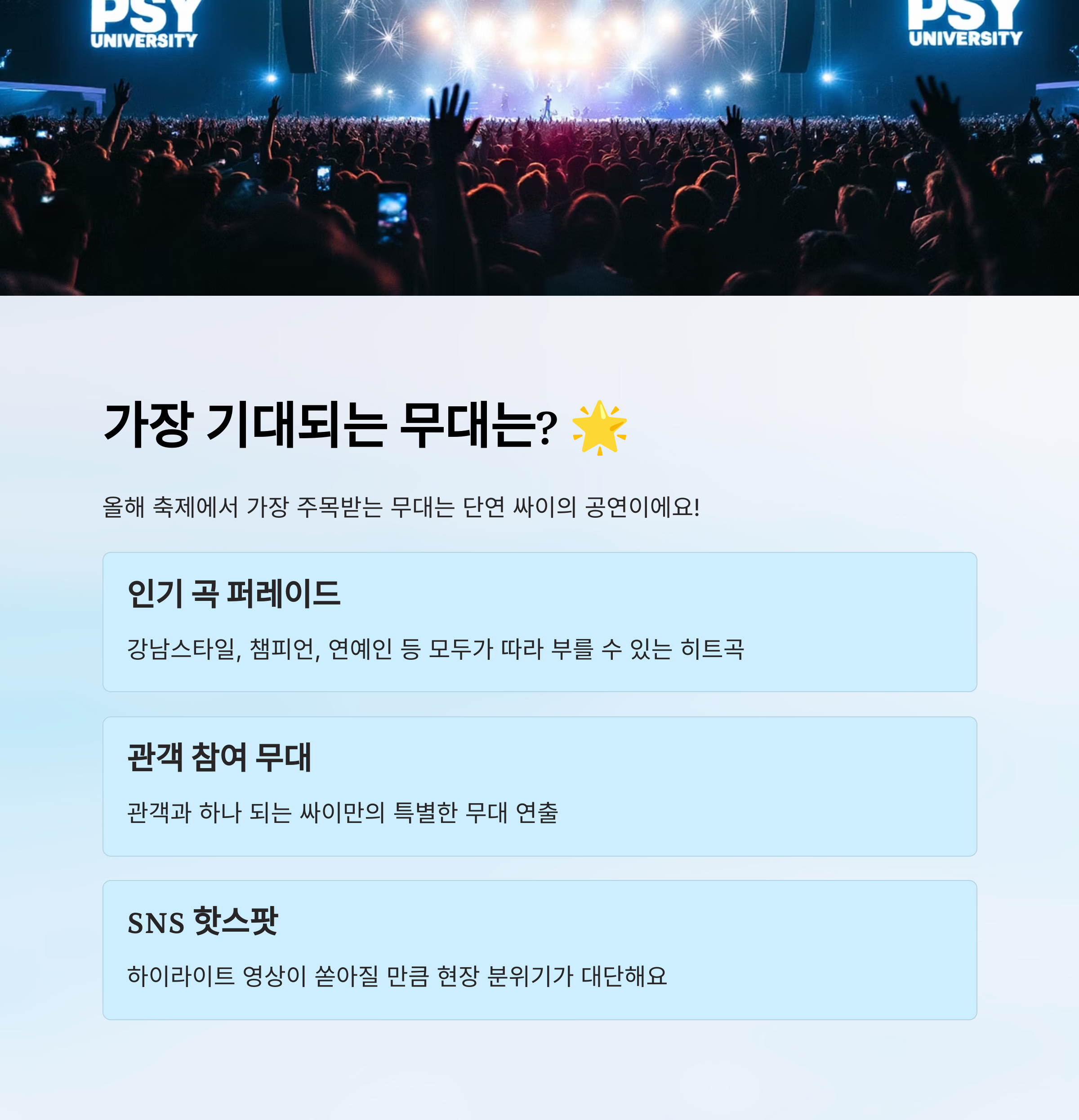 SNS 하이라이트 영상이 쏟아질 만큼 현장 분위기가 정말 대단하니, 싸이 무대가 있는 대학은 특히 주목해 주세요! 📱