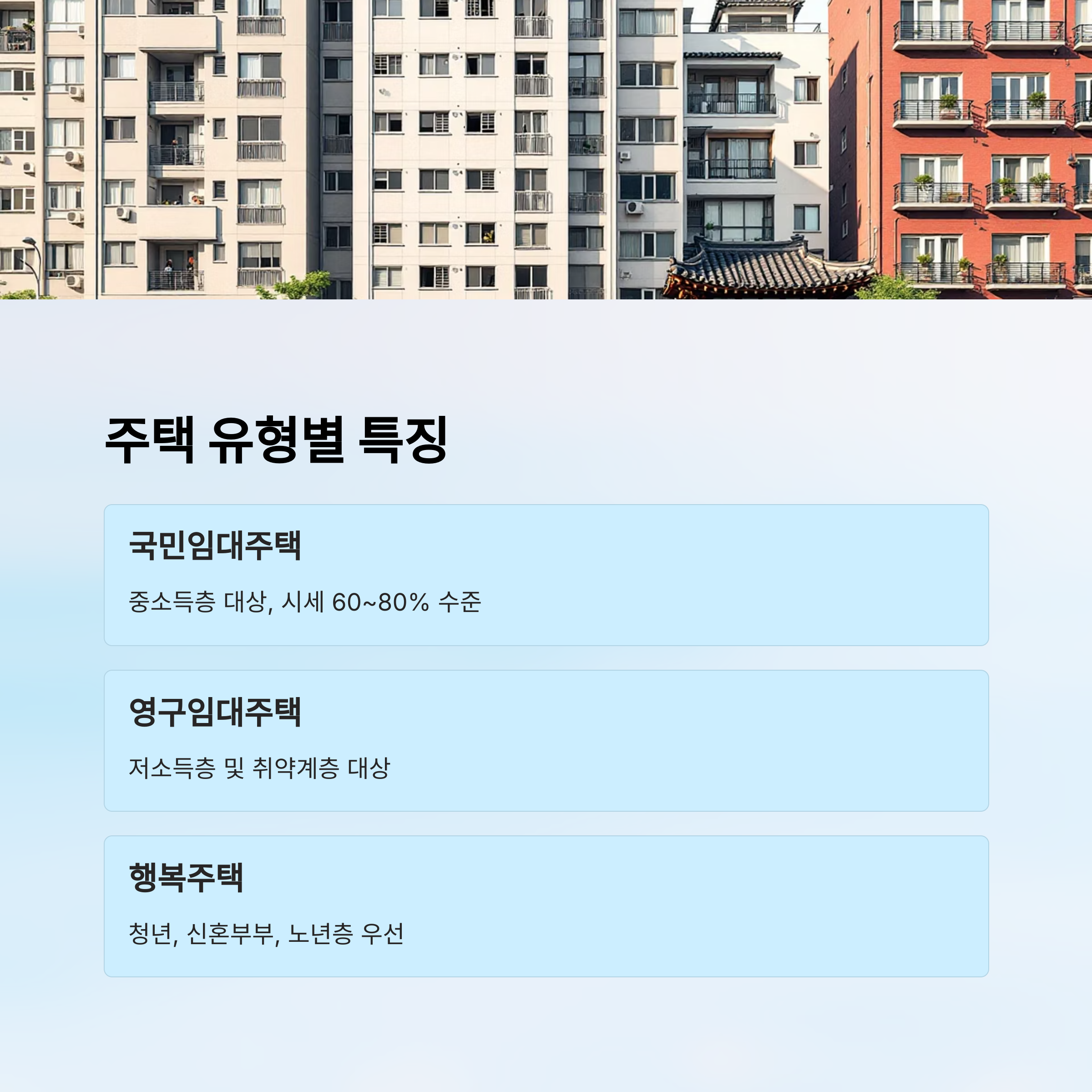 | 국민임대 | 무주택 중저소득층 | 보증금+월세, 거주 안정성 높음 |