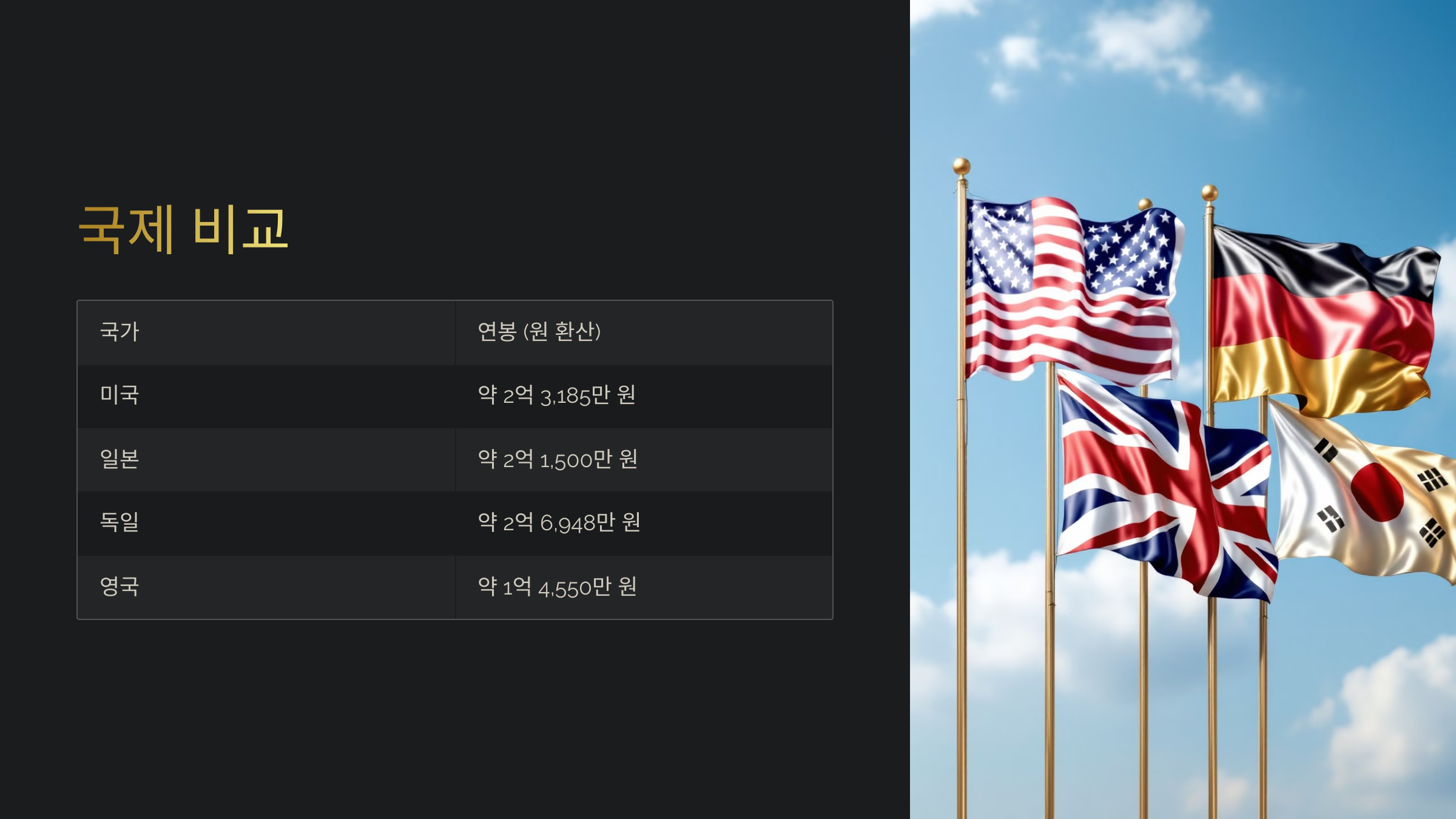 - 영국: 8만 6,584파운드(약 1억 4,550만 원)