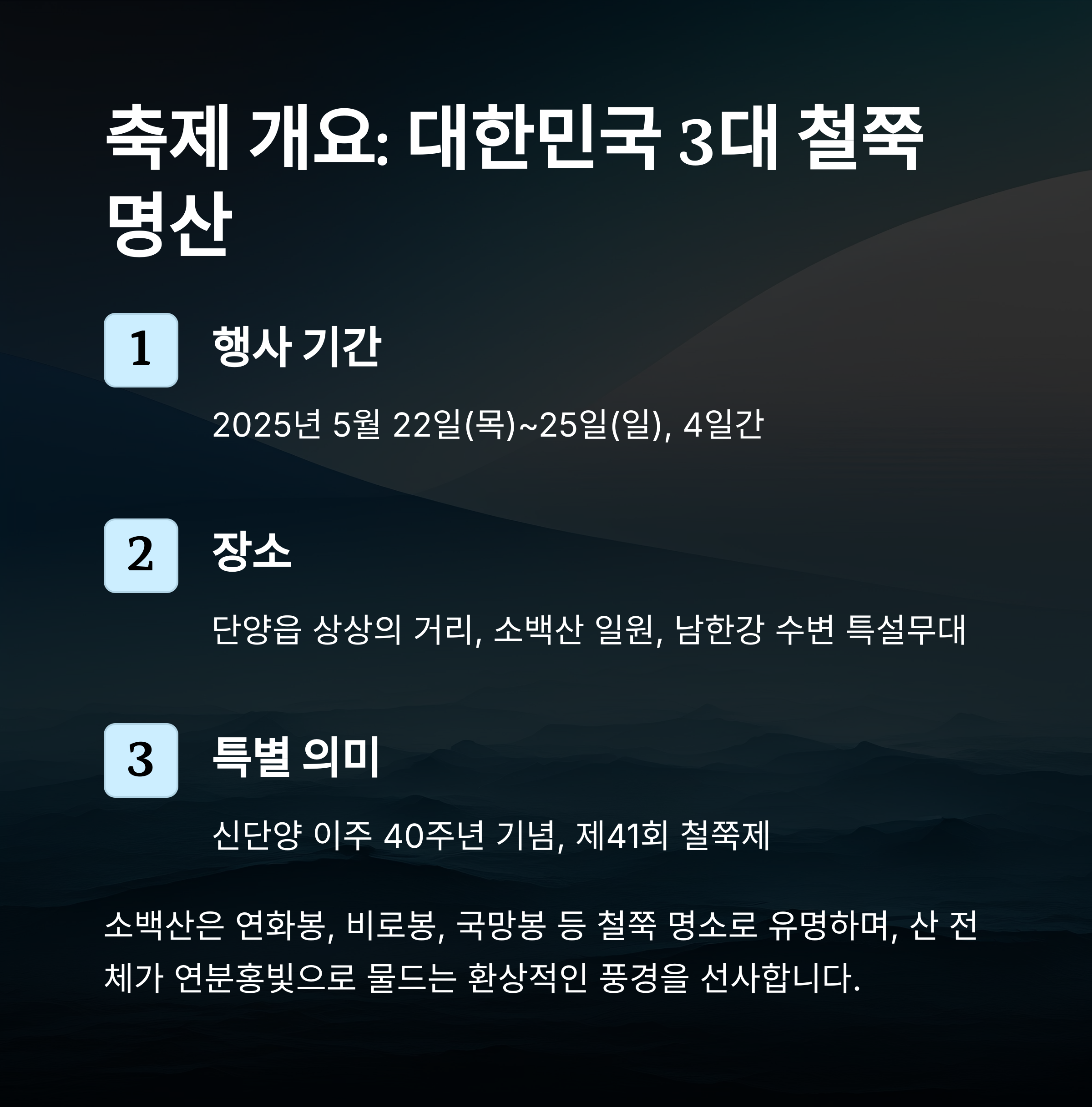 이처럼 2025 단양소백산철쭉제는 과거의 향수와 현대적 감각이 공존하는 축제로 새롭게 탄생했어요. 전통을 존중하면서도 새로운 감각과 기술을 더한 진화된 축제로, 올해의 봄 여행지로 딱이에요!