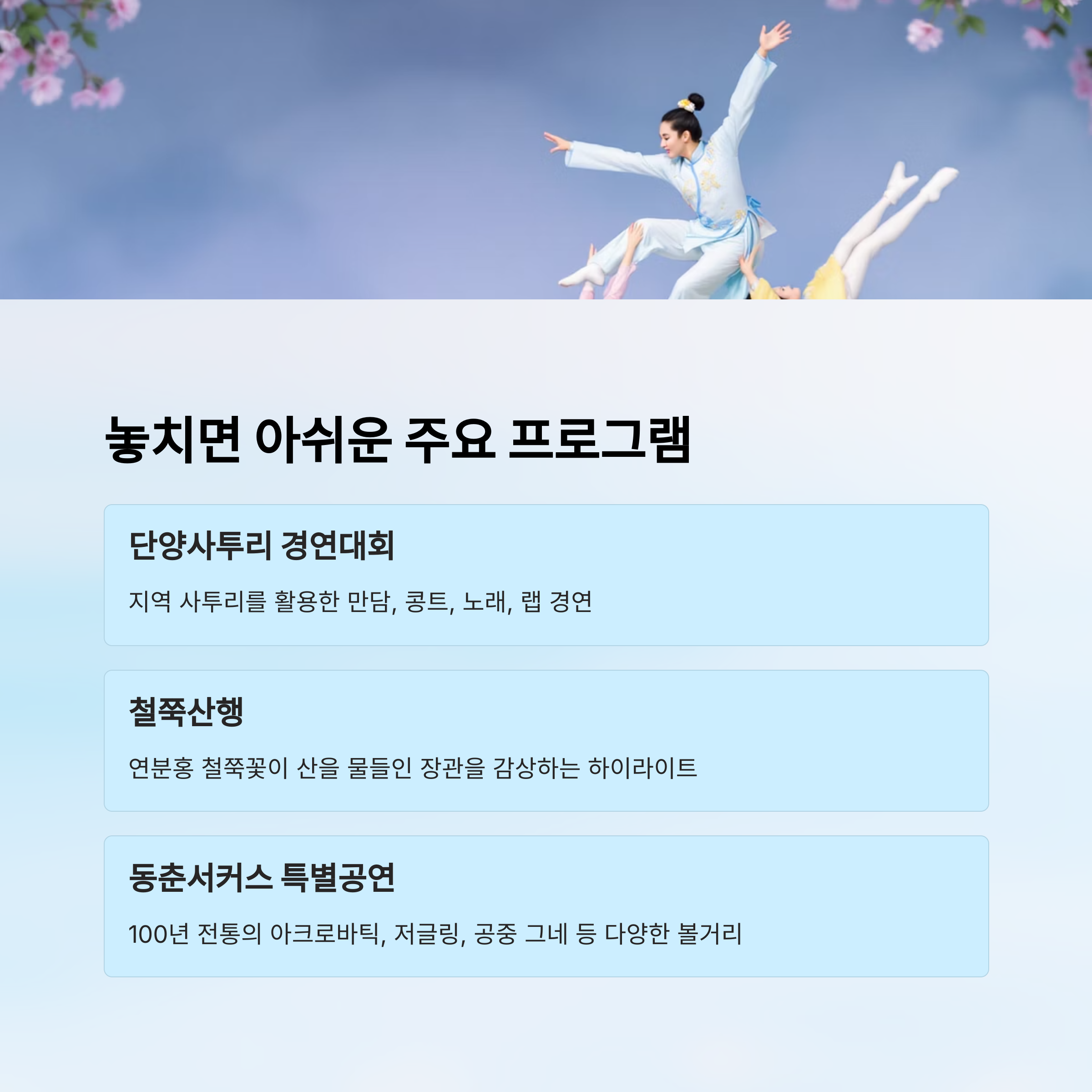 다채롭고 깊이 있는 프로그램들이 마련된 덕분에, 단양소백산철쭉제는 단순한 ‘꽃 구경’의 수준을 넘어서 하나의 종합 문화 축제로 자리잡았어요. 연인, 친구, 가족 누구와 와도 즐거운 시간이 될 거예요! 🎉