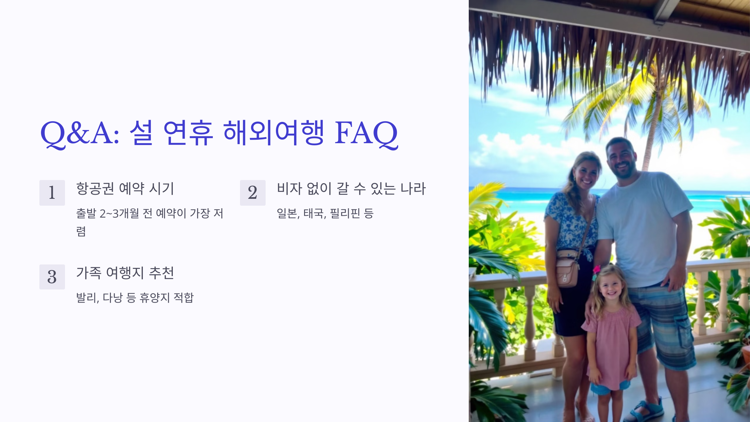 A3. 발리나 다낭 같은 휴양지는 가족 단위 여행객에게 적합합니다.