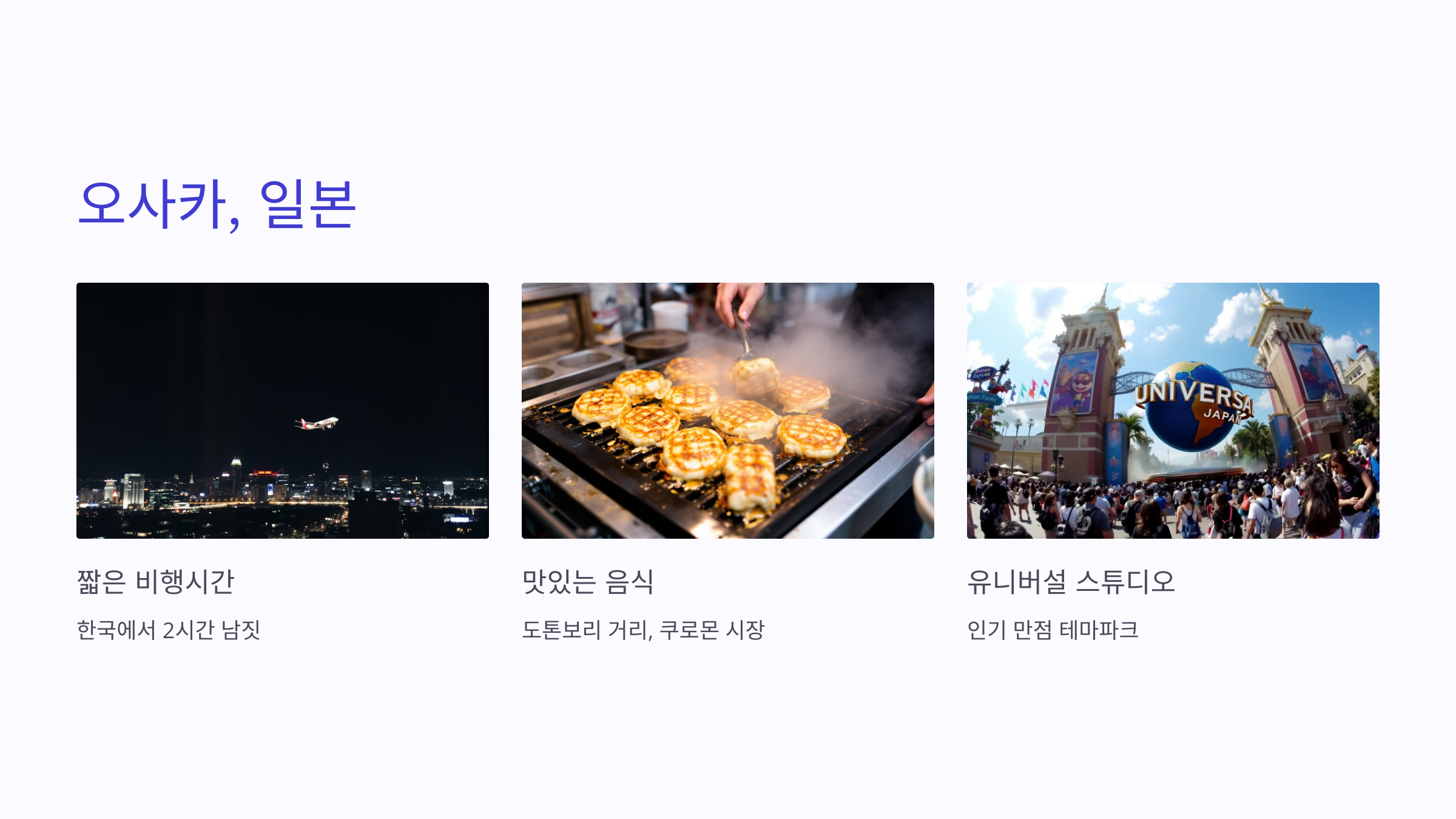 오사카는 한국에서 2시간 남짓으로 도착할 수 있어 연휴에 딱 맞는 여행지입니다. 맛있는 음식, 활기찬 거리, 유니버설 스튜디오 같은 테마파크도 인기 만점!