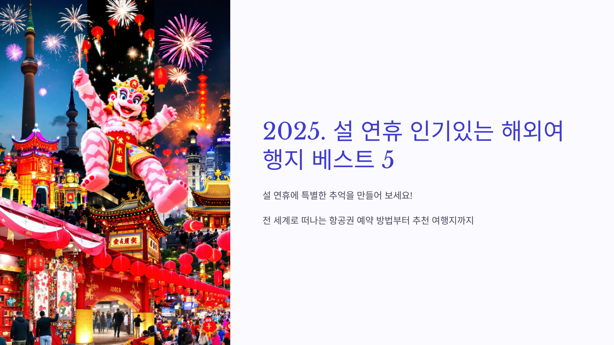 "설 연휴에 집에서만 보내기 아쉬우신가요? ✈️ 짧은 연휴지만 해외여행으로 특별한 추억을 만들어 보세요! 전 세계로 떠나는 항공권 예약 방법부터 추천 여행지까지, 초보자도 쉽게 이해할 수 있는 가이드로 준비했습니다."