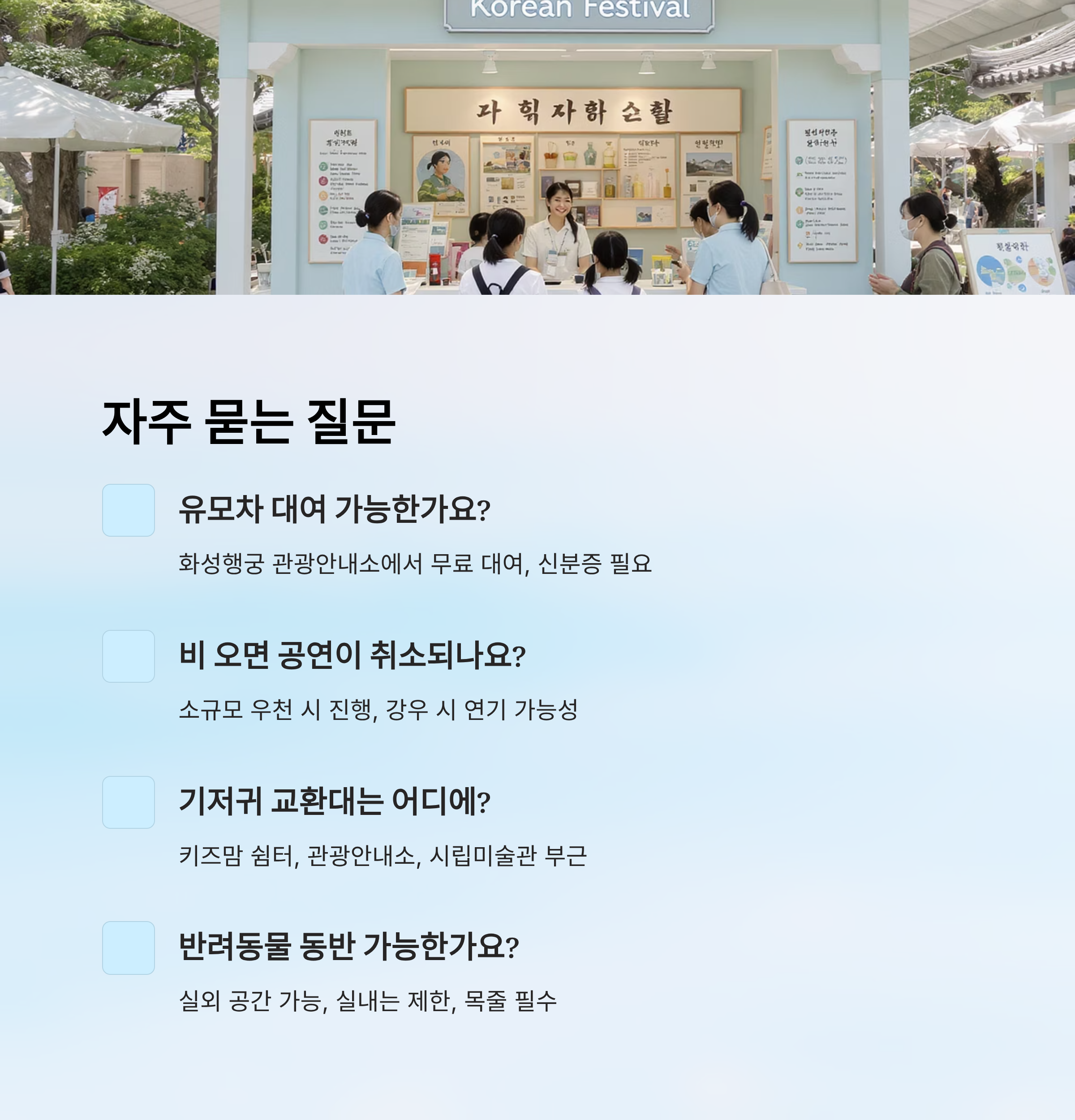 A6. 대부분 실외 공간은 반려동물 동반이 가능하지만, 공연장이나 실내 체험존은 출입이 제한될 수 있어요. 반드시 목줄을 착용하고 배변 봉투도 준비해주세요.