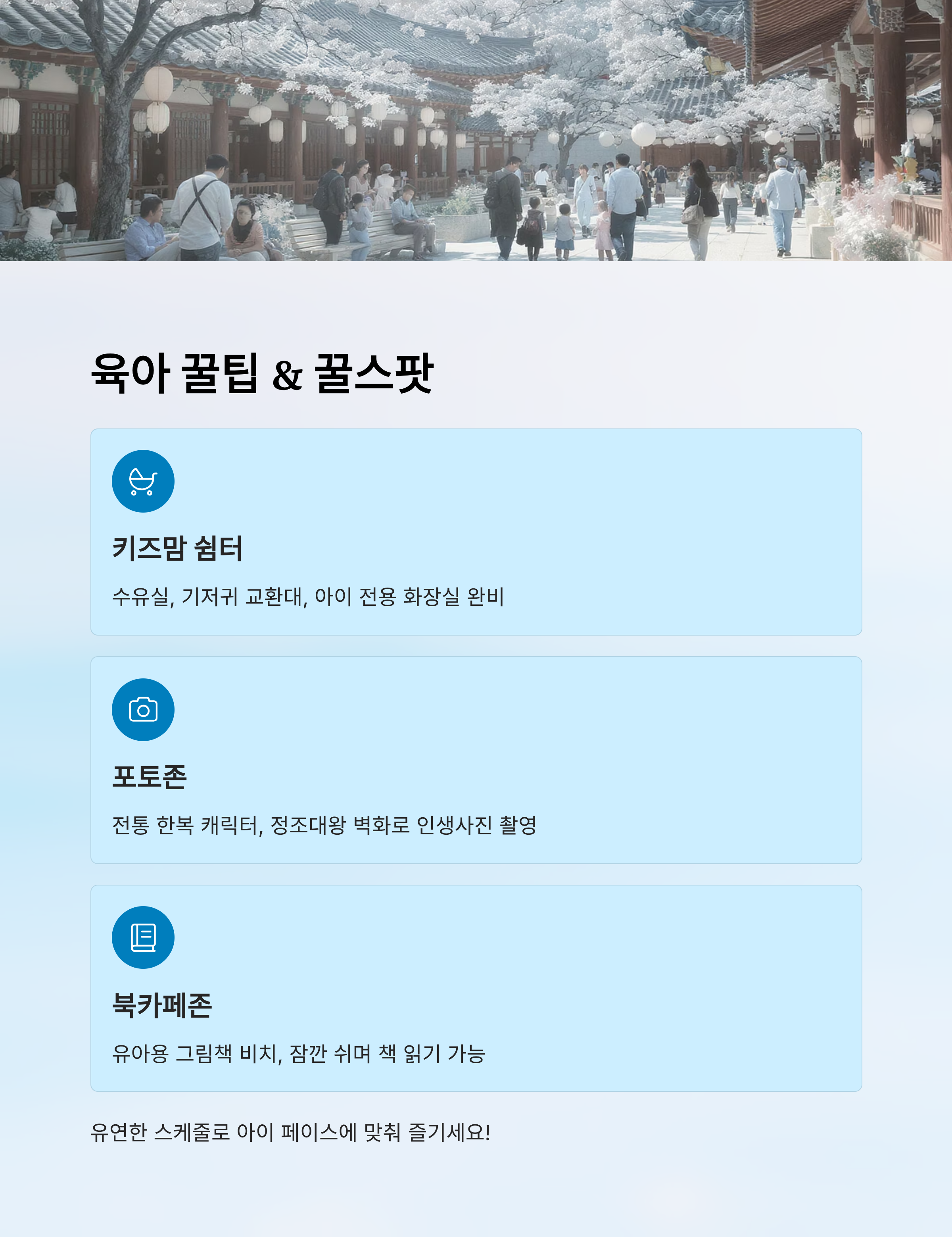 물론, 아무리 계획을 잘 세워도 아이들은 언제나 예측 불가죠! 그래서 중요한 건 유연한 스케줄이에요. 타이트한 계획보다는 ‘쉬어가기 좋은 곳 중심으로 흐름을 만든다’는 마인드가 가장 중요해요 💡
