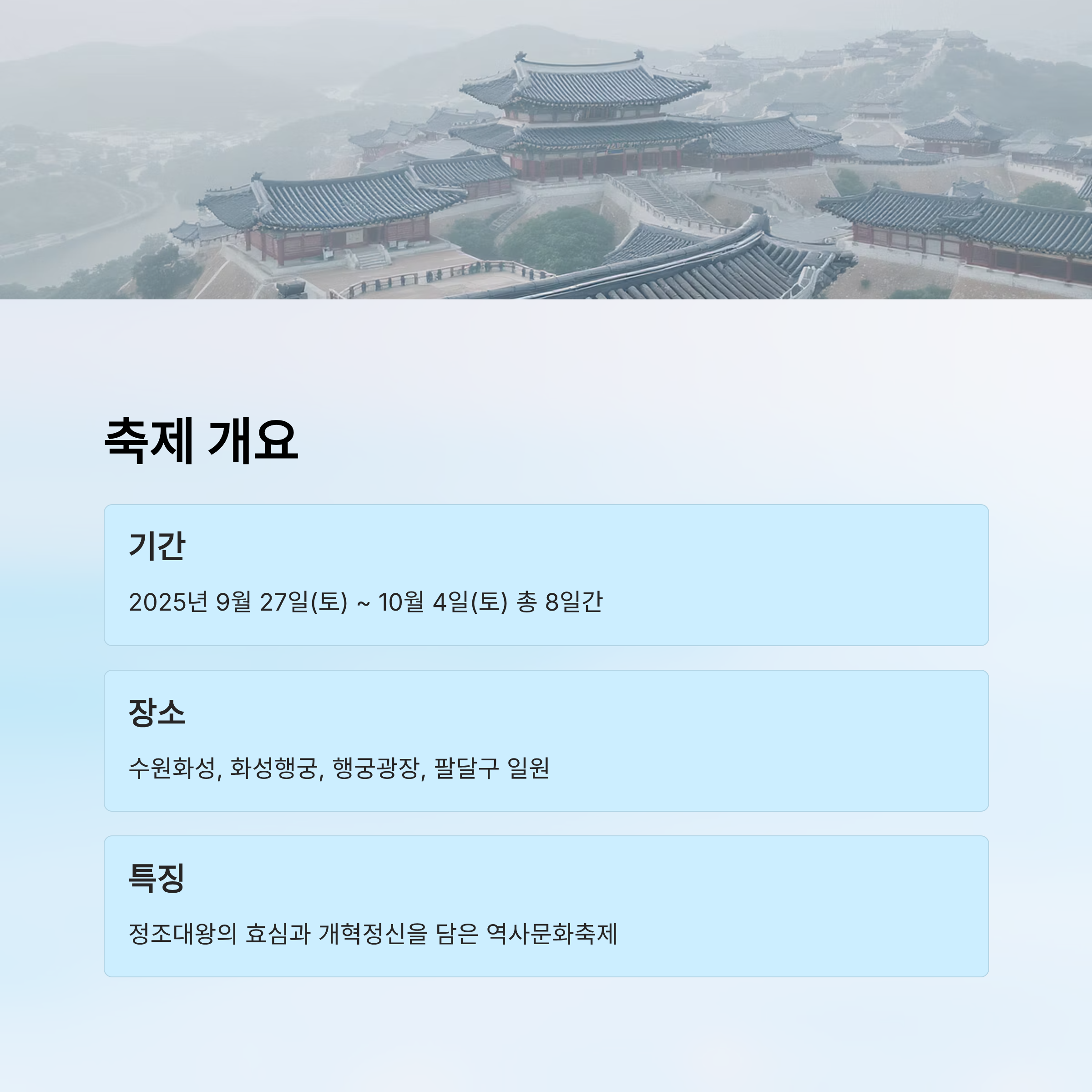 ※ 면책 조항: 본 글은 2025년 9월 기준으로 제공된 정보를 기반으로 작성되었으며, 실제 행사 운영 방식 및 일정은 주최 측 사정에 따라 예고 없이 변경될 수 있어요. 방문 전 반드시 공식 홈페이지 또는 수원시 공식 채널을 통해 최신 정보를 확인해주세요.