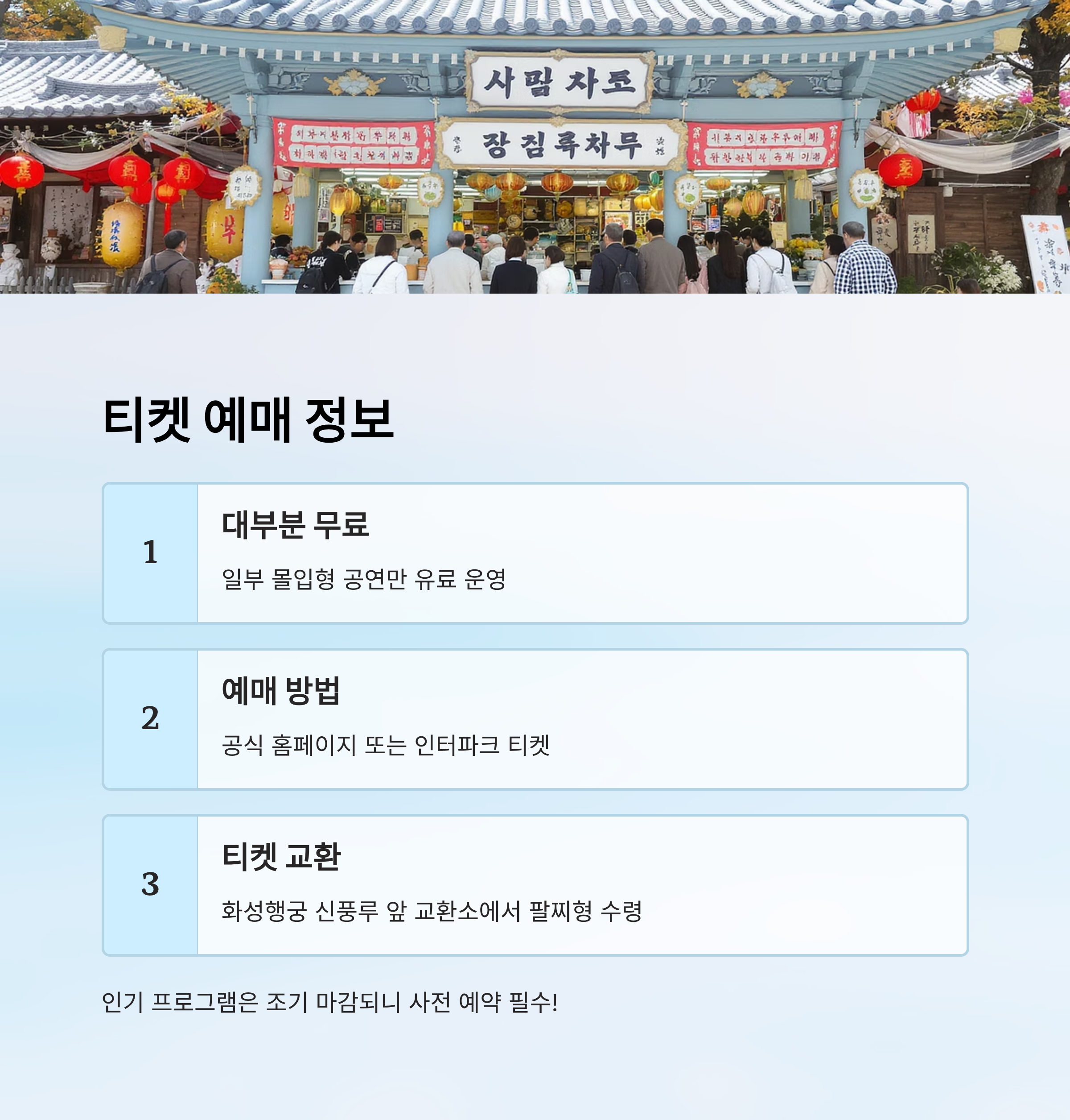 수원화성문화제는 대부분 무료 프로그램으로 구성되어 있지만, 일부 몰입형 공연과 예술 콘텐츠는 유료로 운영돼요. 특히 인기 많은 프로그램은 조기 마감될 수 있으니 사전 예약은 필수예요!
