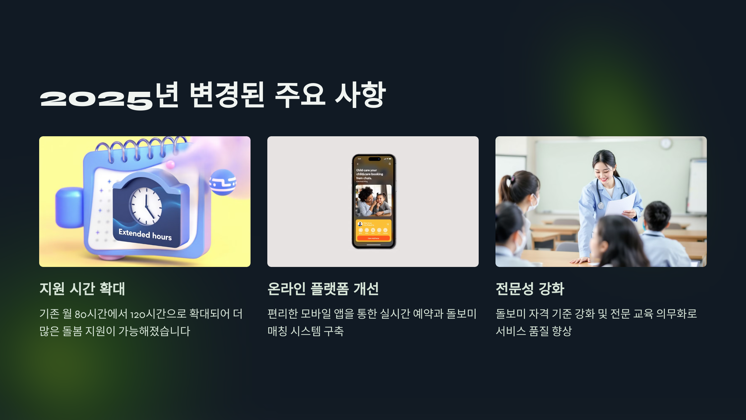 - 아이돌보미의 자격 및 교육 기준 강화로 더 신뢰할 수 있는 서비스 제공.