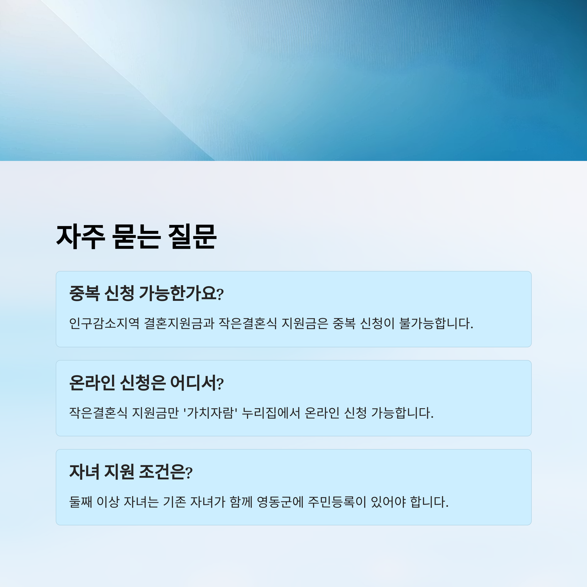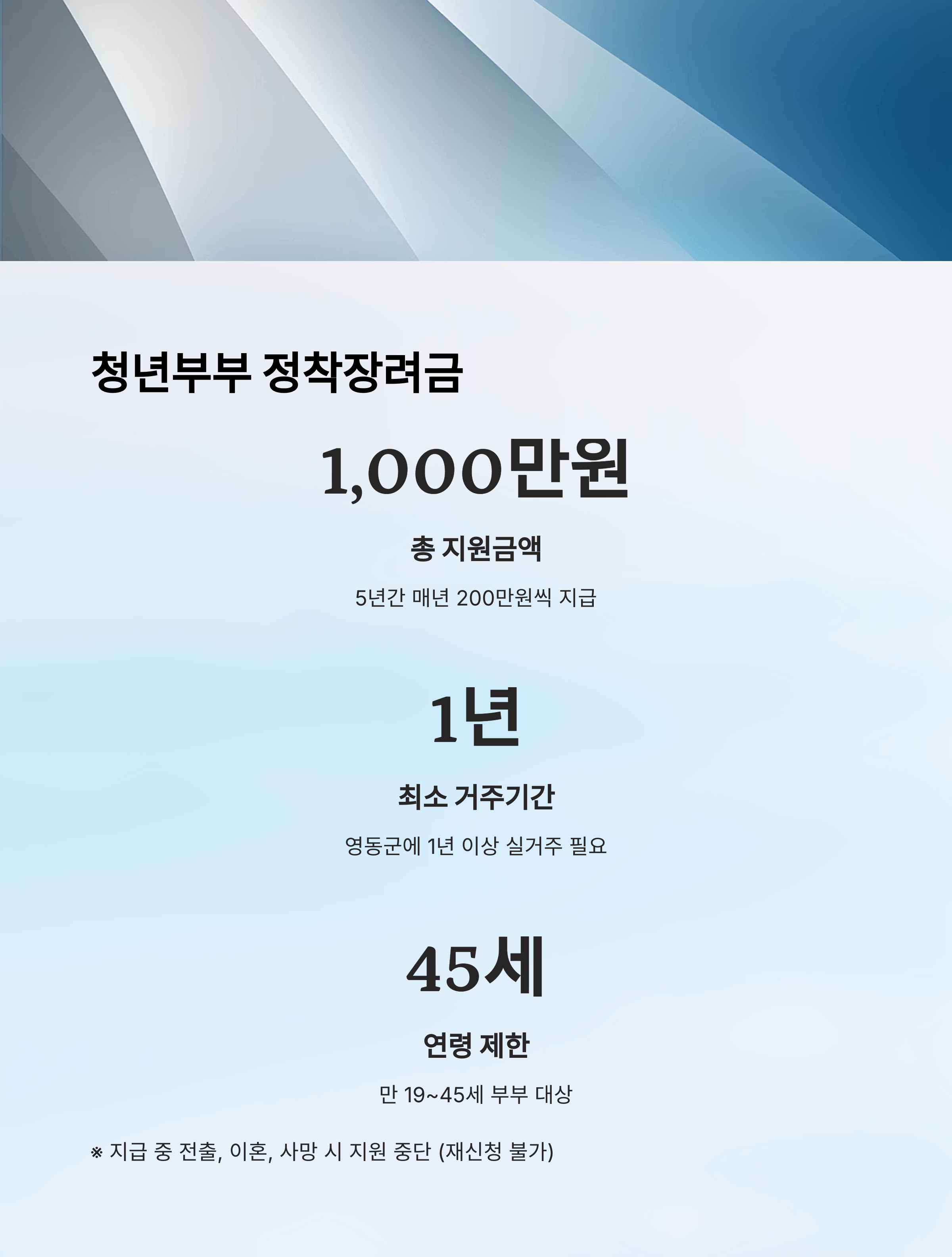 | 거주 요건 | 부부 중 1명 이상 영동군 6개월 이상 주민등록 |