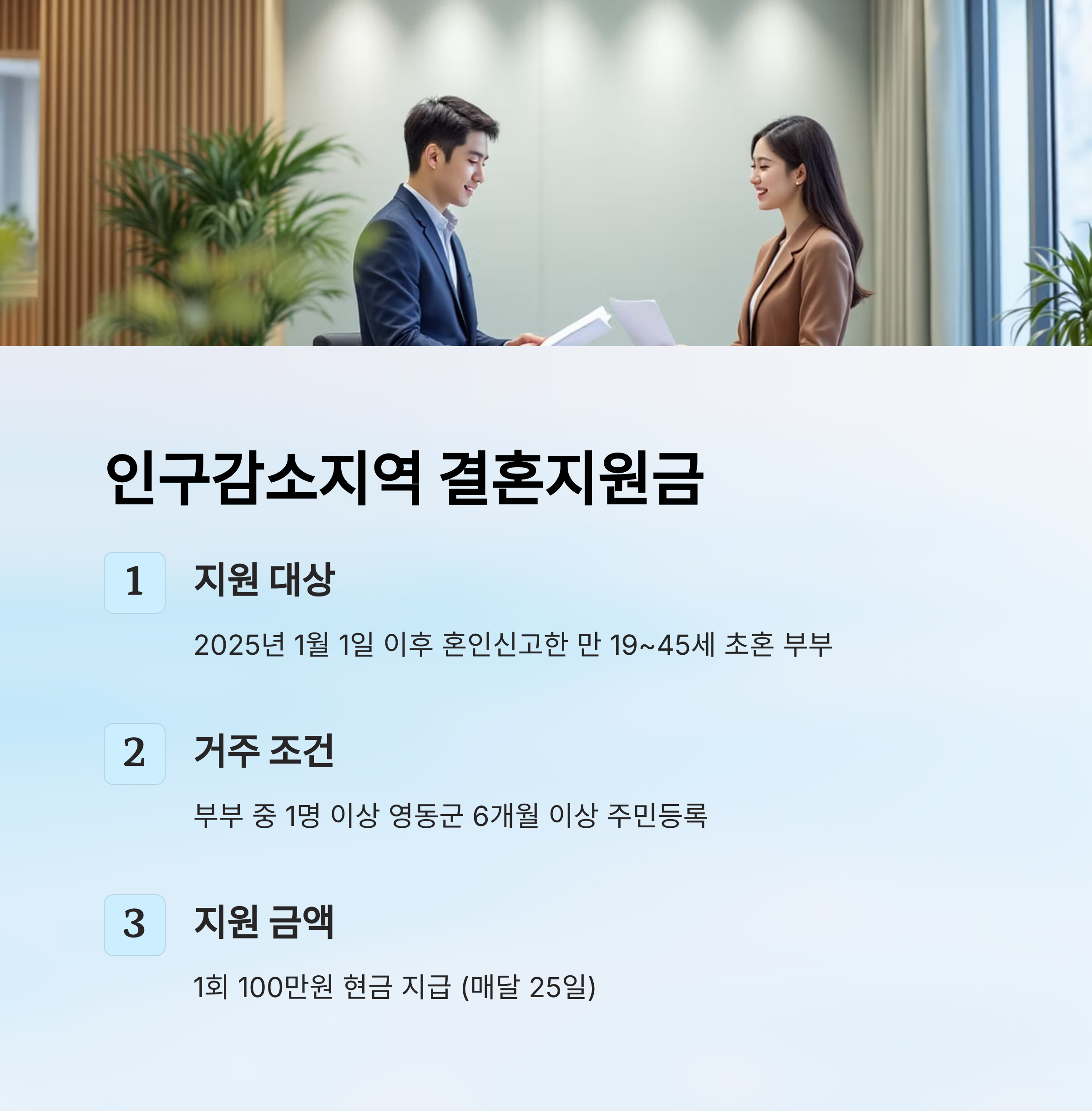 대상은 2024년 1월 1일 이후 혼인신고를 한 만 19세 이상 45세 이하 부부이며, 영동군에 1년 이상 함께 거주하고 있어야 해요. 부부 중 한 명만 조건을 만족해도 된답니다.
