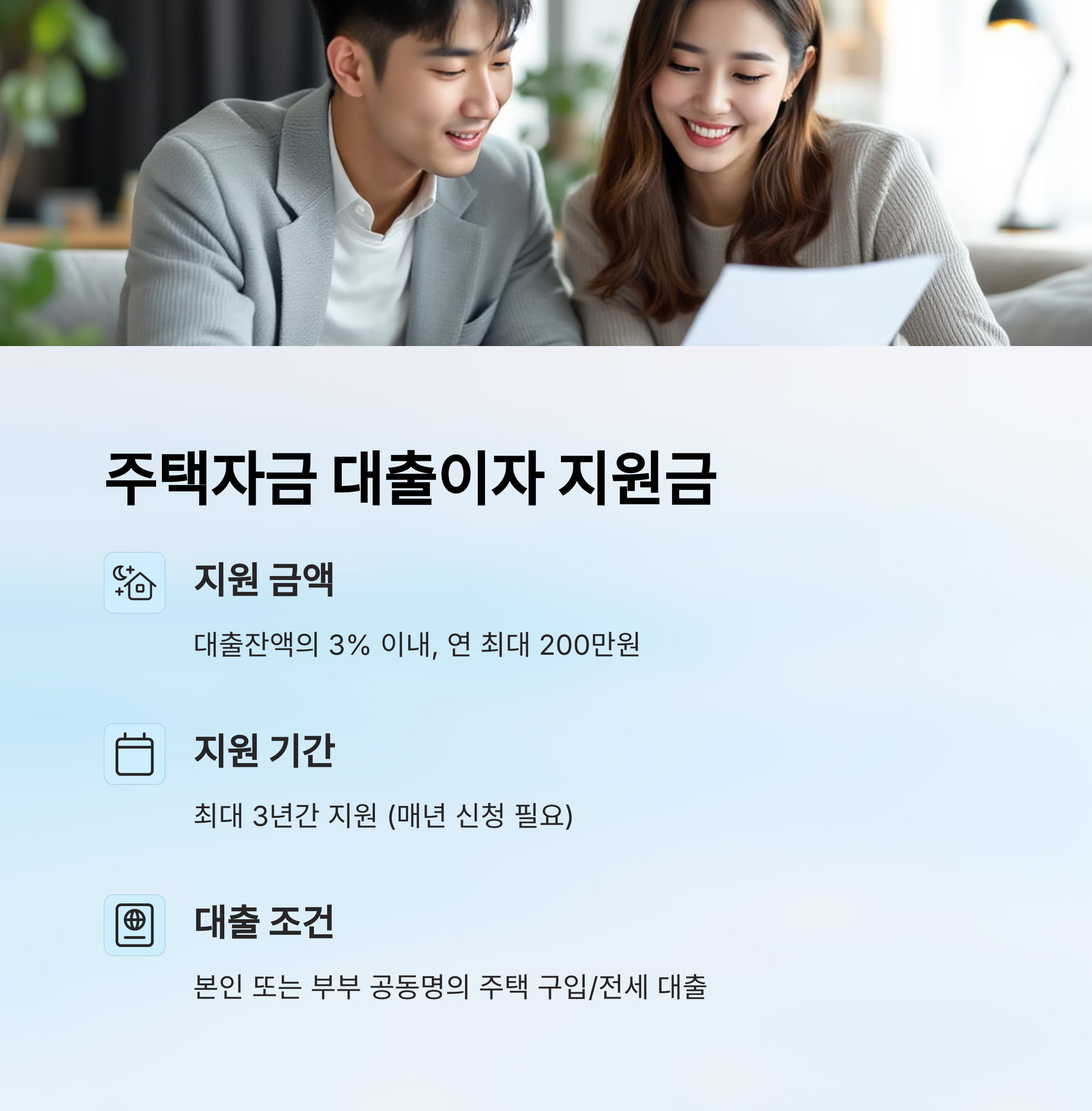 다음은 신혼부부라면 절대 놓칠 수 없는 💰 '주택자금 대출이자 지원금' 안내로 이어서 설명할게요. 계속 볼까요?