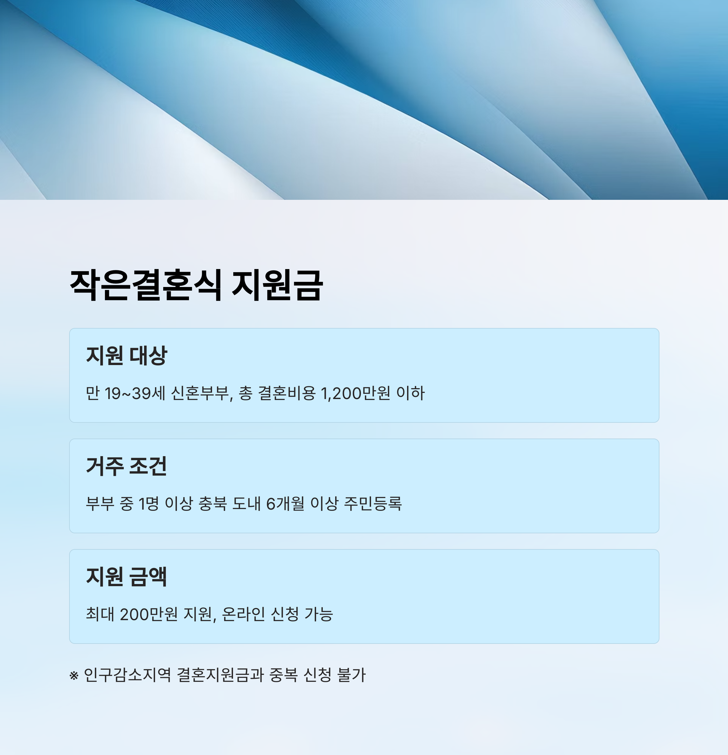 | 거주 요건 | 부부 중 1명 이상 충북 도내 6개월 이상 주민등록 |