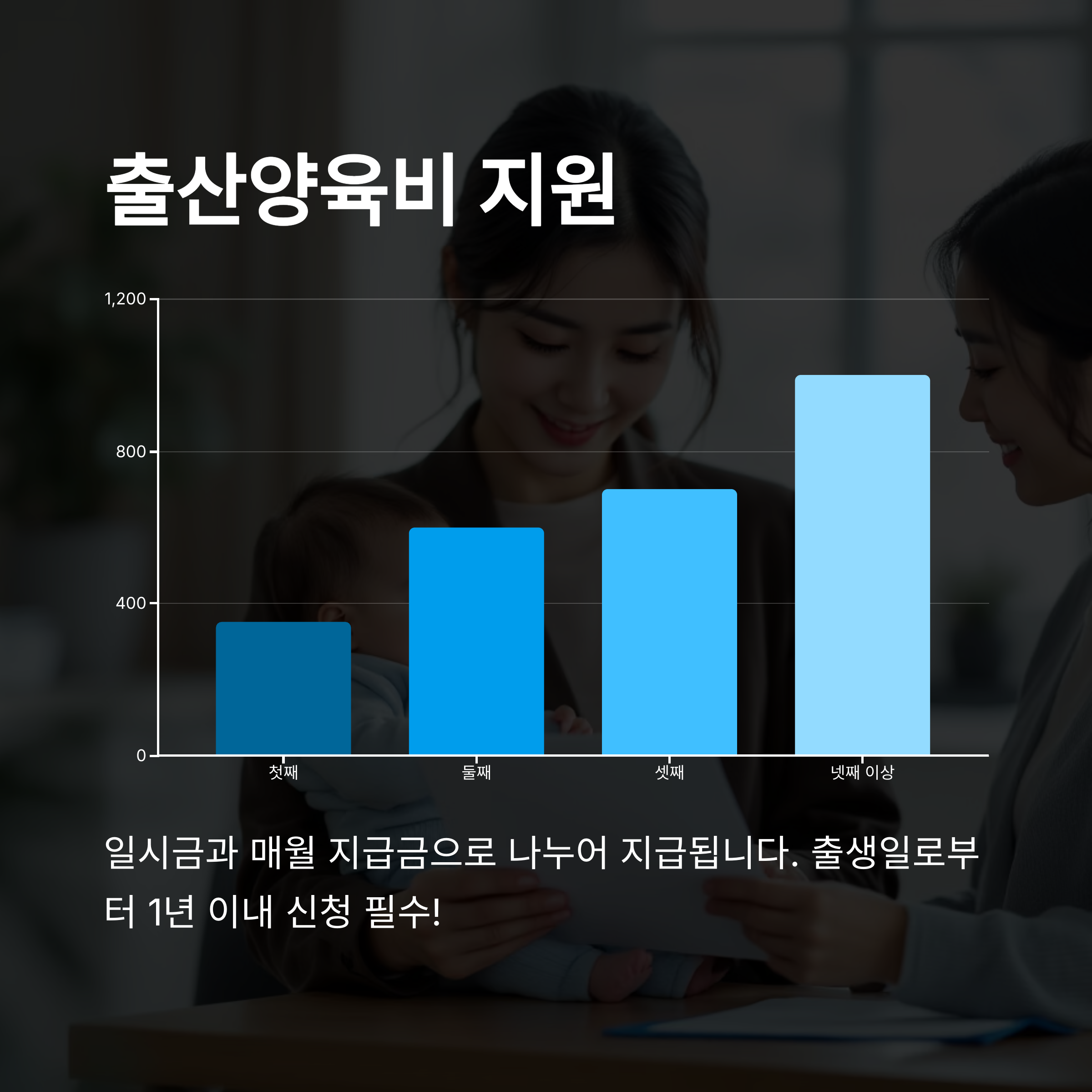 출산양육비는 일시금과 매월 지급금이 나눠져 있는데요. 첫째부터 넷째 이상까지 지원금이 차등 지급돼서 다자녀 가정일수록 더 큰 혜택을 받을 수 있어요.