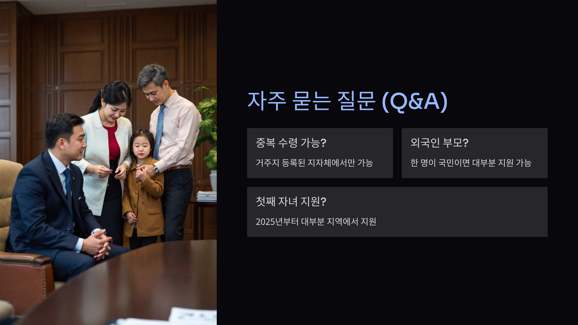 💡 유의사항: 일부 지역은 현금 지급 외에도 육아용품, 돌봄 서비스, 교육비 지원 등 추가 혜택을 제공합니다.