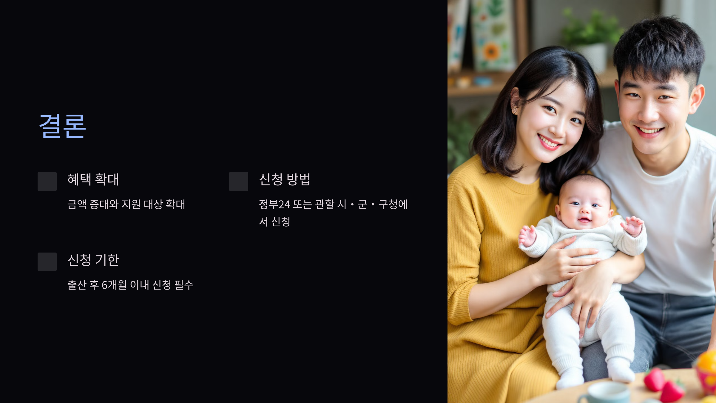 💡 팁: 신청 기한은 출산 후 6개월 이내인 경우가 많으므로 서둘러 신청하세요!